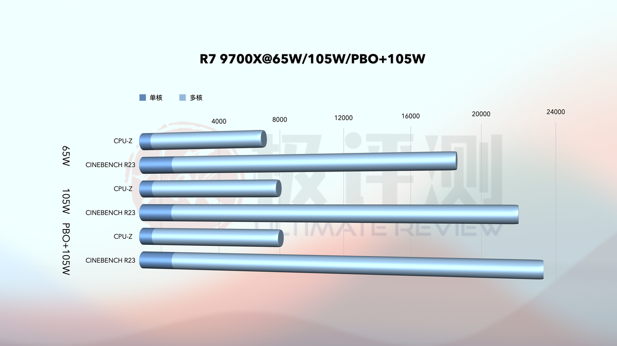 R7 9700X在开启105W后性能提升明显,多核性能最高提升17%以上,并且开启PBO之后,处理器多核性能可以进一步提升,如果要将这颗处理器性能压榨到极致,建议开启105W+PBO模式。