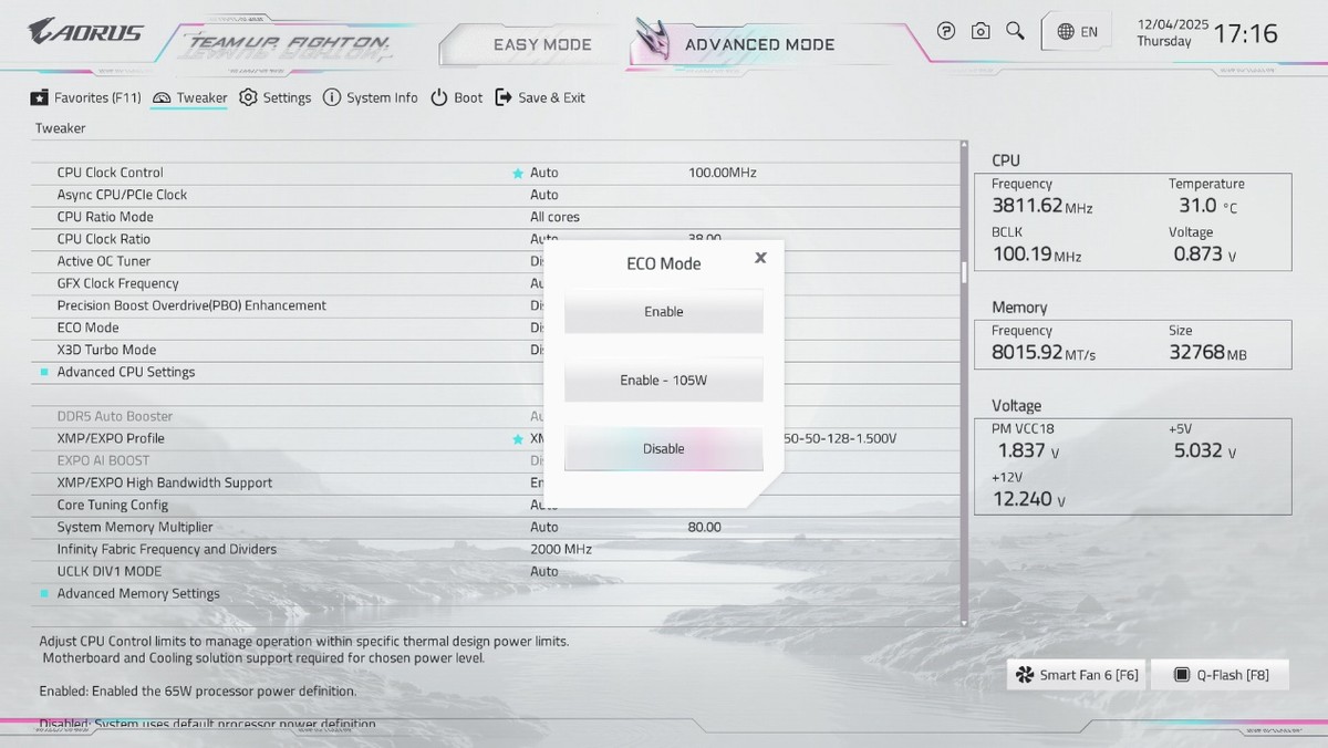 BIOS内在ADVANCED MODE下,进入Tweaker选项页,进入ECO Mode,将ECO Mode设置为Enable-105W,即可将处理器TDP设置为105W。我们来看下105W下性能提升有多大。