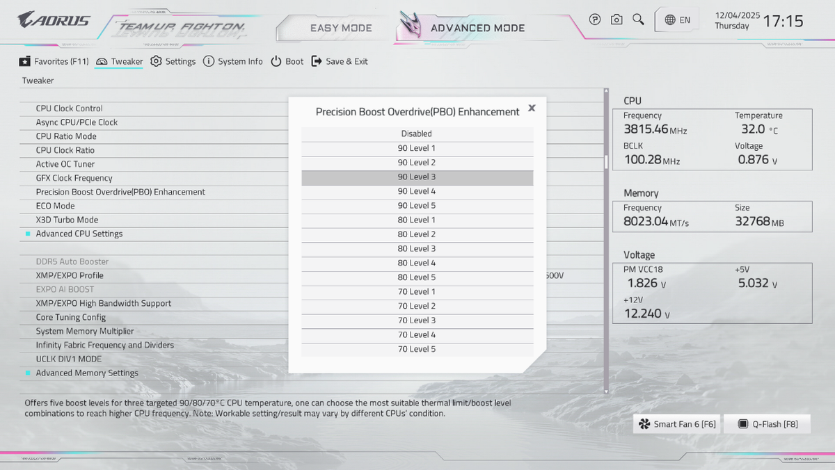 在ADVANCED MODE下,进入Tweaker选项页,进入Precision Boost Overdrive(PBO) Enhancement选项,这个选项分为70/80/90三组温度墙,每组温度墙设置了Level1~5 5个选项,共计15档。从Level 1~5性能从低到高,通常建议用户从Level 3开始调试,根据处理器体质进行调节。