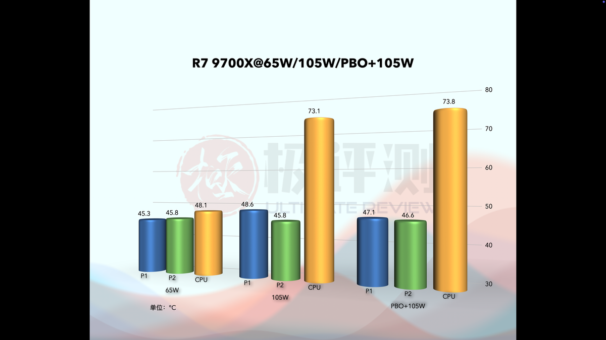 在开启105W+PBO模式后,9700X处理器核心温度上升明显,建议为它配备一款360水冷散热器,以发挥其最大的性能。