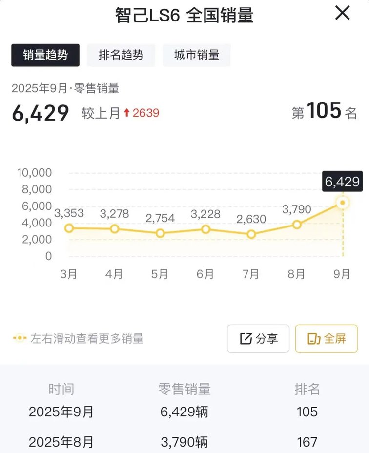 尽管智己汽车未直接公布LS6的具体销量,但第三方数据显示,该车9月销量为6429辆,占品牌总销量的57.8%,贡献了超半数的销量份额,其战略地位可见一斑。不过,这款被寄予厚望的车型,其市场表现是否能称得上“成功”呢?还需从多维度深入剖析。