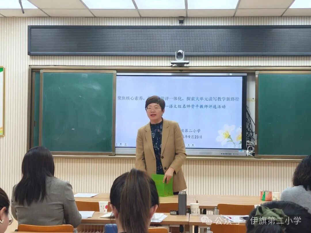 活动最后,韩俊琴校长进行总结发言。她对五位执教老师的精彩表现给予高度评价,强调名优骨干教师是学校教育发展的核心力量,希望全体教师以此次活动为契机,立足课堂、深耕教研,不断提升自身专业能力。同时,她也明确了学校未来教师培养的方向,鼓励大家在教学实践中勇于创新、乐于分享,共同推动伊旗第二小学教育教学质量再上新台阶。