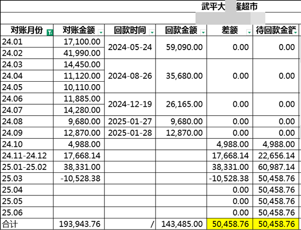2024年01月至2025年06月,龙岩市惠*贸易有限责任公司购买火锅料、冰淇淋品牌等预包装食品商品,尚欠货款50458元,期间多次催促未结算,目前仍欠款人民币:50458元。