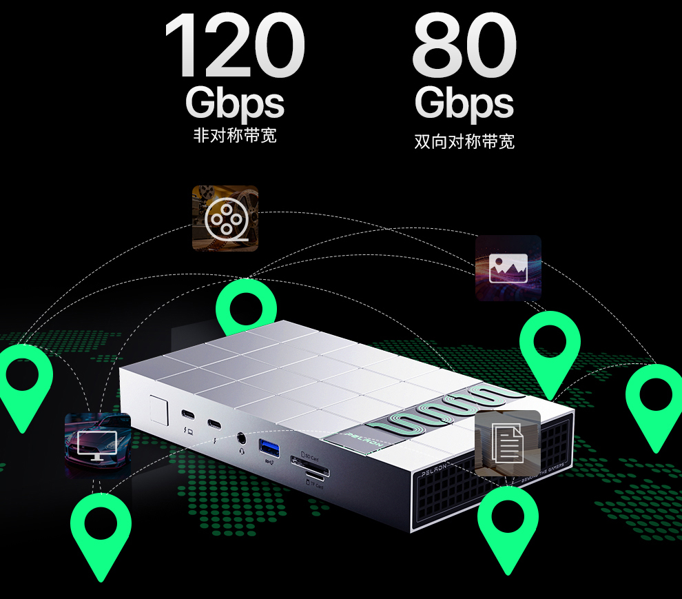 作为核心亮点,这款扩展坞搭载2个兼容雷电5的高速传输接口,支持高达80Gbps的双向对称传输或120/40Gbps的非对称传输,上行+下行双模式:
