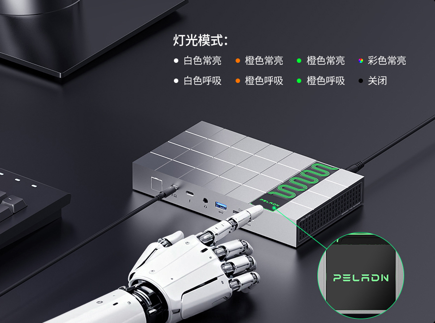 磐镭Link G2E扩展坞有银色、灰色2种颜色可供挑选,一共配备了13个扩展接口,让你彻底告别“接口焦虑”,机身还集成了8种可切换或关闭的RGB灯光模式,轻松触摸切换氛围,为工作生活营造更加温馨、舒适的氛围。