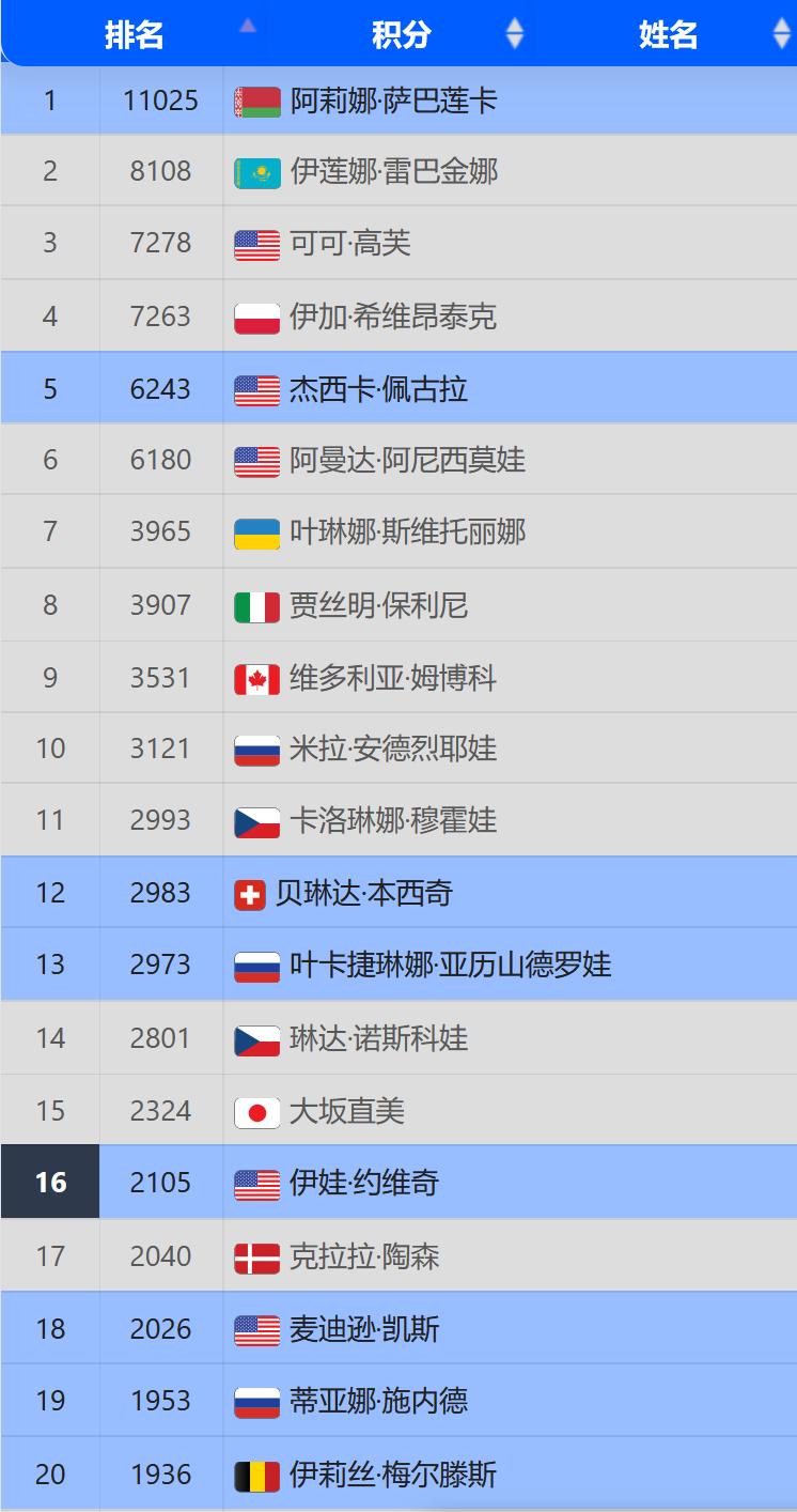 其他前十的球员,保利尼损失去年四强积分,排名被斯维托丽娜超过,下跌一位至第8。