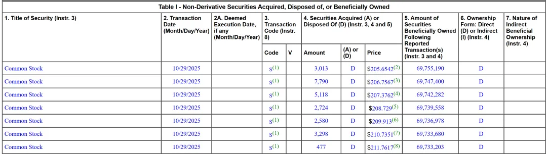 值得注意的是,10月29日英伟达股价触及212.19美元/股的历史高点,黄仁勋同日向美国证监会提交的“报表4”——证券受益所有权变动声明显示,他当天通过七笔交易合计出售2.5万股,其中最高一笔以211.76美元/股的价格卖出477股。该日后,其名下持有的英伟达股票数量为6975.5万股。