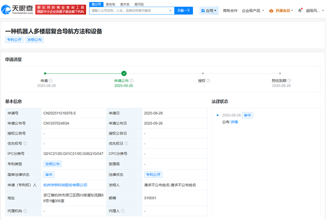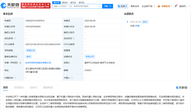 天眼查App显示,9月26日,杭州宇树科技股份有限公司申请的“一种机器人多楼层复合导航方法和设备”专利公布。