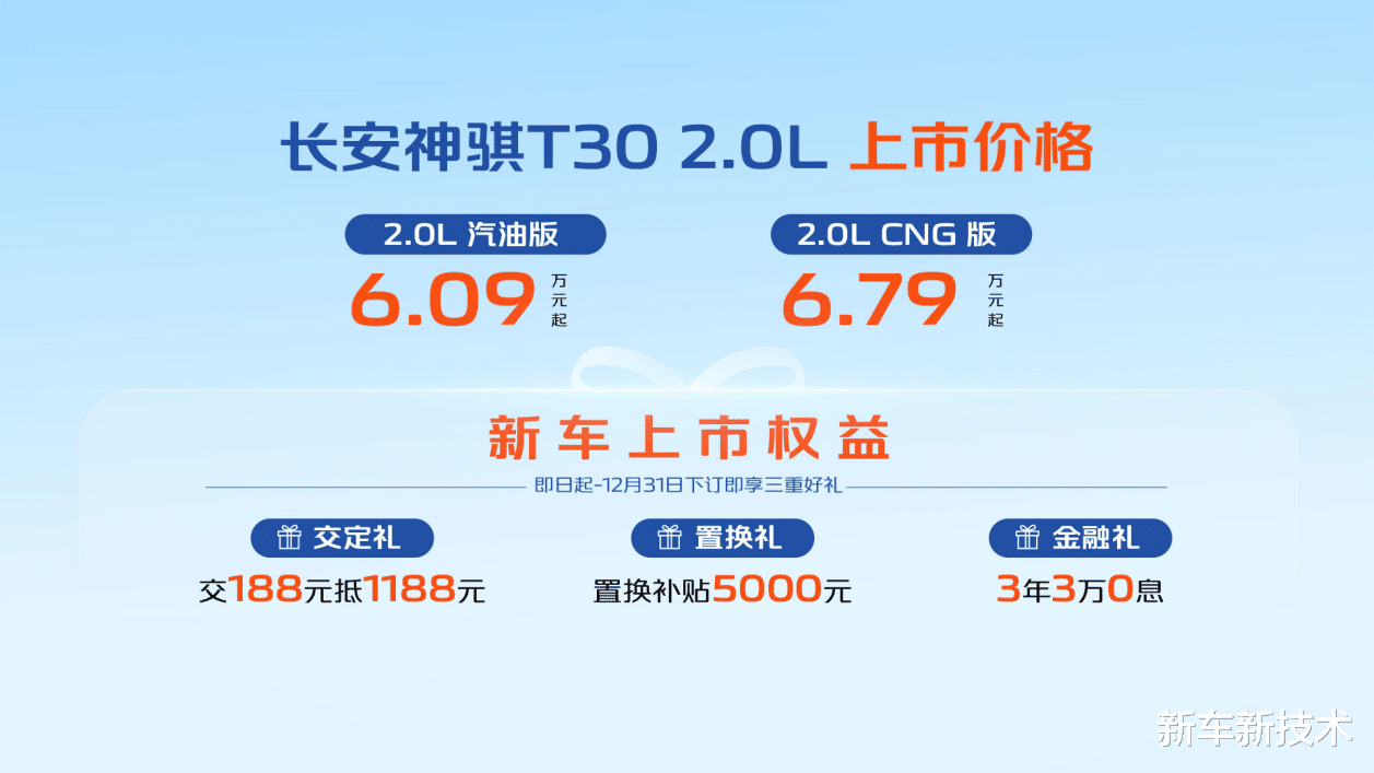 11月27日,“强芯进阶 不惧重载”长安神骐T30 2.0L全国联动上市。新车共推出2.0L汽油和CNG两种动力版本,官方指导价6.09万元起,即日起至12月31日下订即享三大新车上市权益。