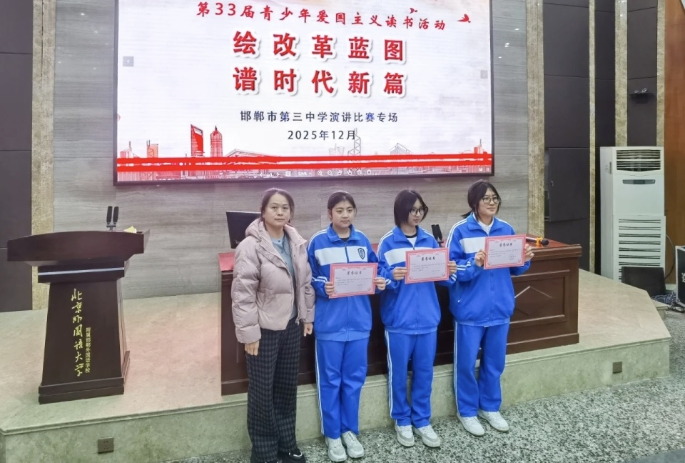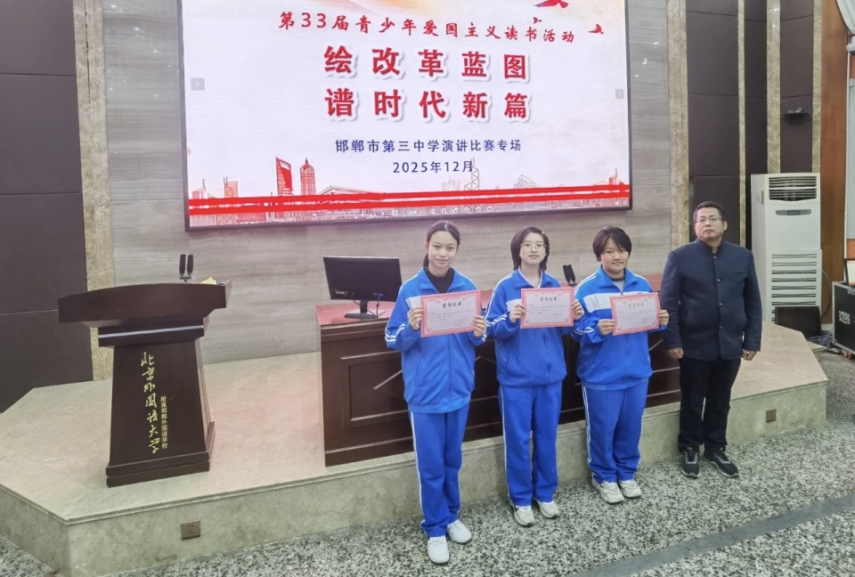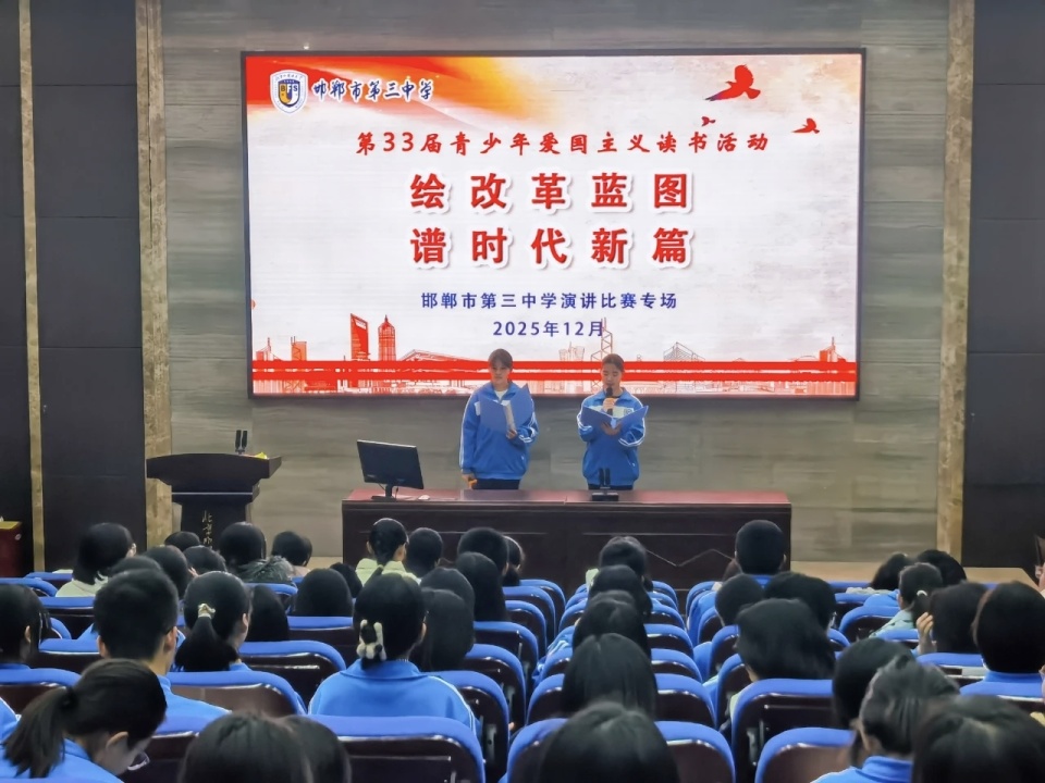 为深入学习贯彻党的二十大精神,引导广大青少年坚定理想信念,厚植爱国情怀,2025年12月,邯郸市第三中学成功举办了第33届爱国主义读书教育演讲比赛。本次比赛以“绘改革蓝图 谱时代新篇”为主题,旨在通过演讲的形式,激励同学们抒发爱国之情、砥砺报国之志。