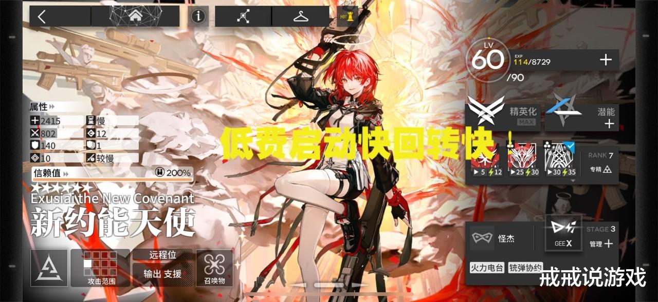 新能目前的风评吃到了界园很大红利,不过她本身就是大c!二技能dps1.1w,三技能dps1.2w,全游出伤天花板。范围就是速射范围,马马虎虎,但是新能的生存很强。首先,新能的怪杰模板是不会扣到死的,会留1血,如果没有对高台或者溅射的话不用管就行。其次,新能自己就能回血,不过要消耗弹药,也就是要接敌。第三,二技能能带来一个数值极高的屏障,一击线相当高,为能天使的输出提供了十分充裕的时间。