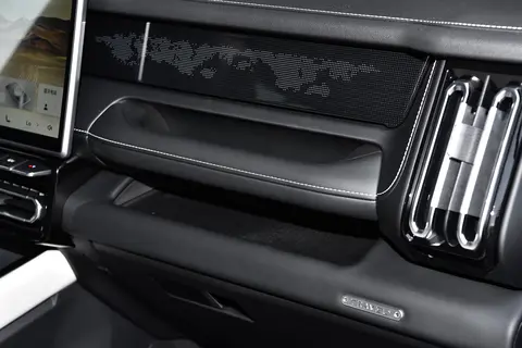 视线移至车侧,平直有力的线条勾勒出扎实稳健的车身姿态。19英寸的Y形轮毂、宽大的黑色轮眉以及实用的固定式上车踏板,不仅强化了视觉上的力量感,也提升了上下车的便利性。车尾的设计同样简洁有力,熏黑的竖式LED尾灯内部采用了与前脸呼应的四点式设计,宽厚的后保险杠则无声地诉说着其应对复杂路况的底气。