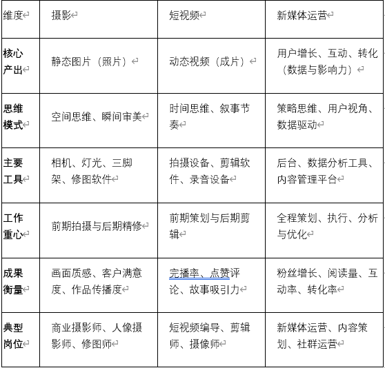 职业发展路径:路径多元且交织。可以成为短视频编导、剪辑师、摄像师,也可以运营自己的账号成为博主。能力模型更复合,容易横向扩展到更长的视频内容创作(如纪录片、微电影)或直播等领域。