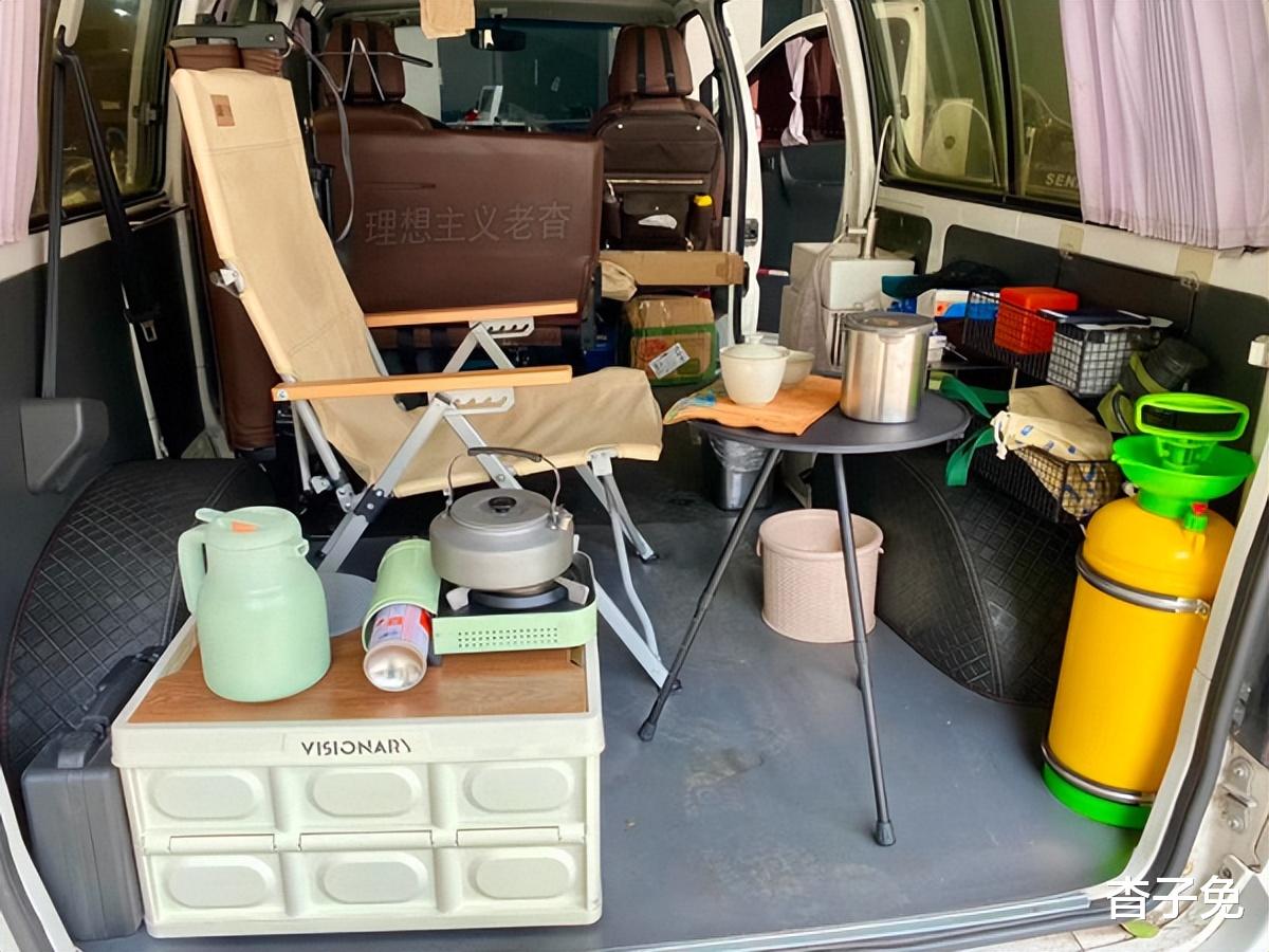 打开上掀式尾门,车后就是生活区,有简易折叠靠椅和三角长腿小圆桌,还有收纳箱存放一些生活用品。