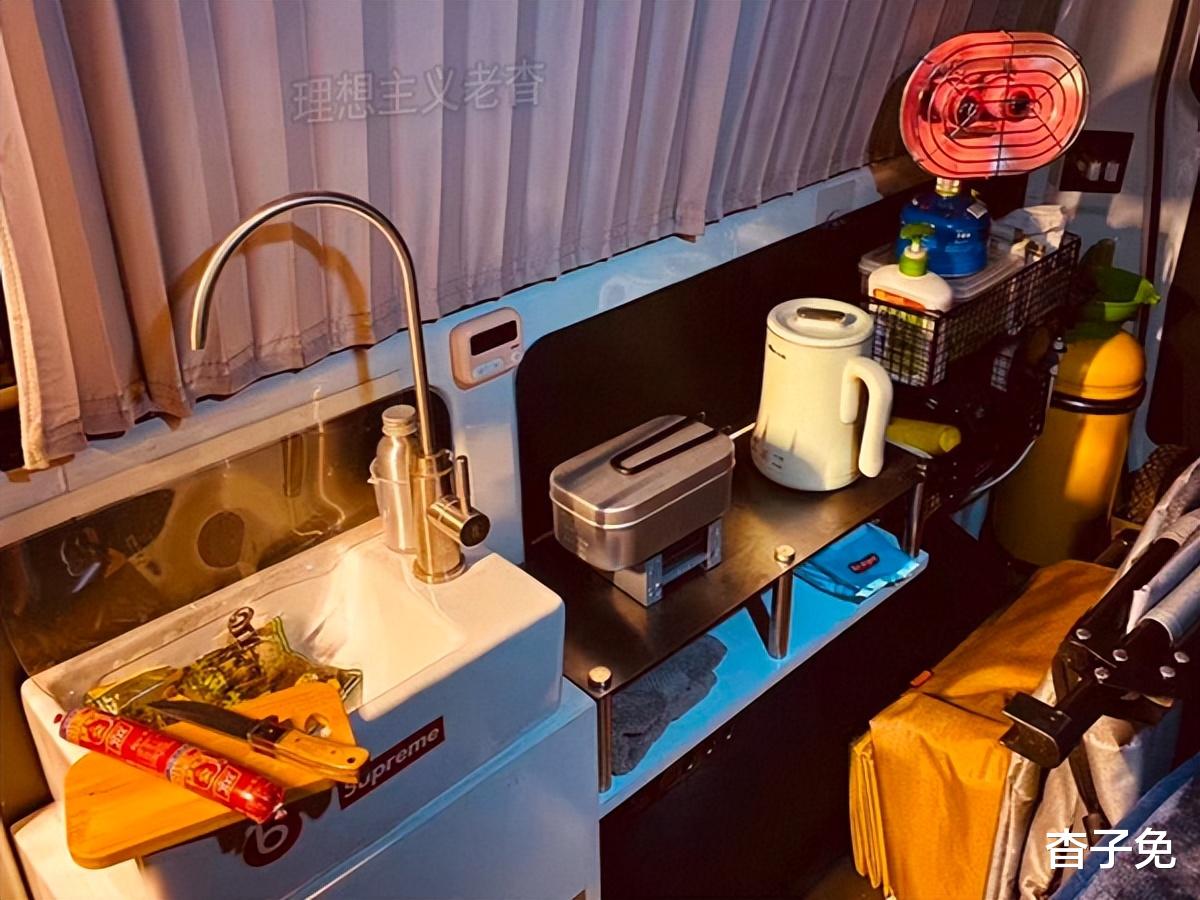 右侧是微厨区,有洗菜池,小气灶、热水壶等厨房用具,虽然台架比较简陋,但摆放还是比较整齐的,自驾游路上只要能烧水做饭即可。