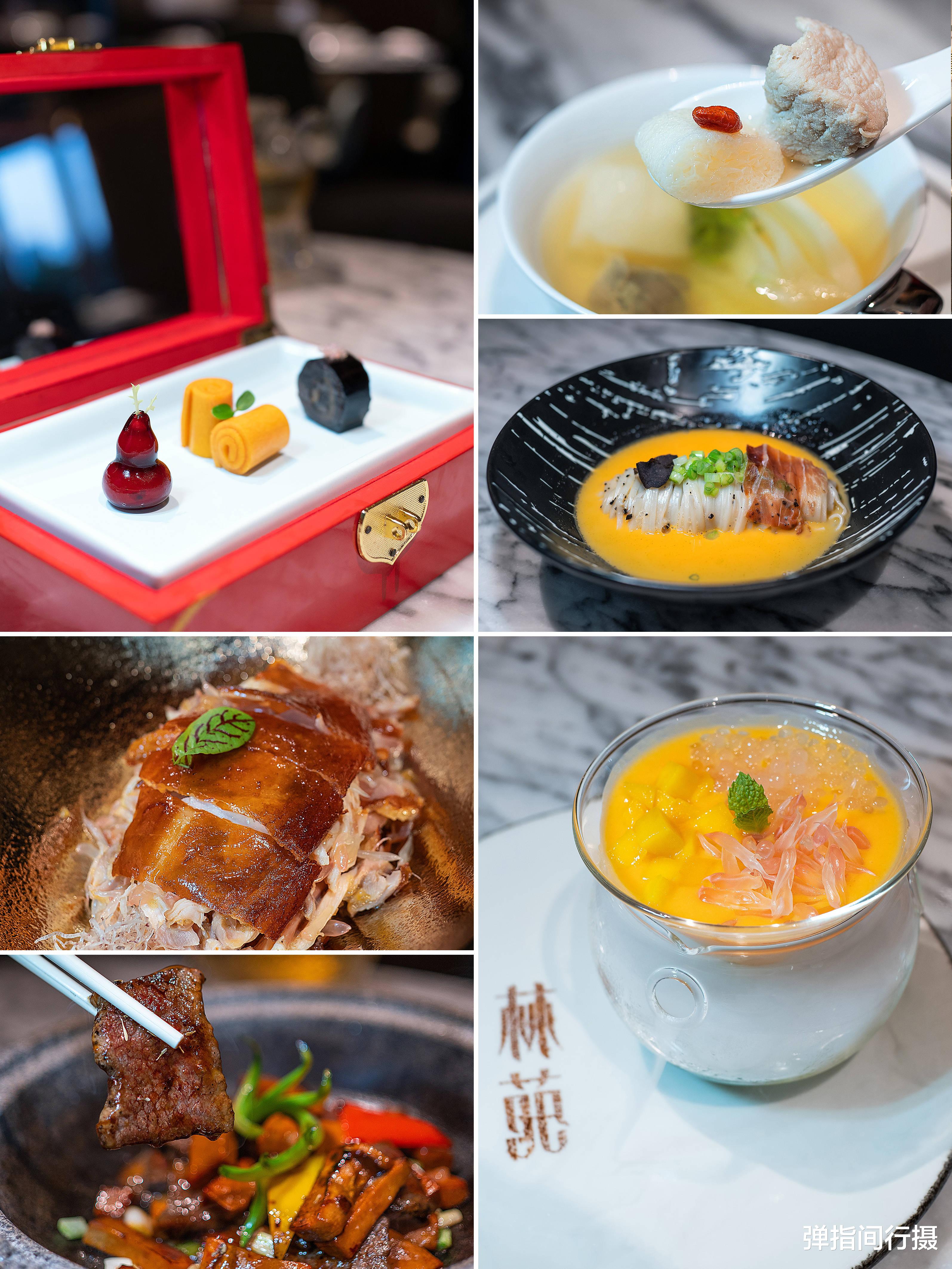 主厨团队深谙粤菜精髓,菜单随季节变化。当晚品尝的柚子脆皮手撕荔枝鸡令人难忘,选用本地荔枝鸡经风干烤制,鸡皮薄脆透亮,柚子果肉巧妙解腻;石烧牛肝菌超雪花牛肉现场烹制,和牛油脂在火山石上滋滋作响;龙虾汤黑松露拌稻庭面汤底浓郁,现刨黑松露香气扑鼻;猪腱肉鲜菌炖菜胆汤清味醇;樱花虾鸡汤煮菜苗将时令鲜蔬的嫩脆发挥到极致。每道菜品都印证着“用心对待”的料理哲学。