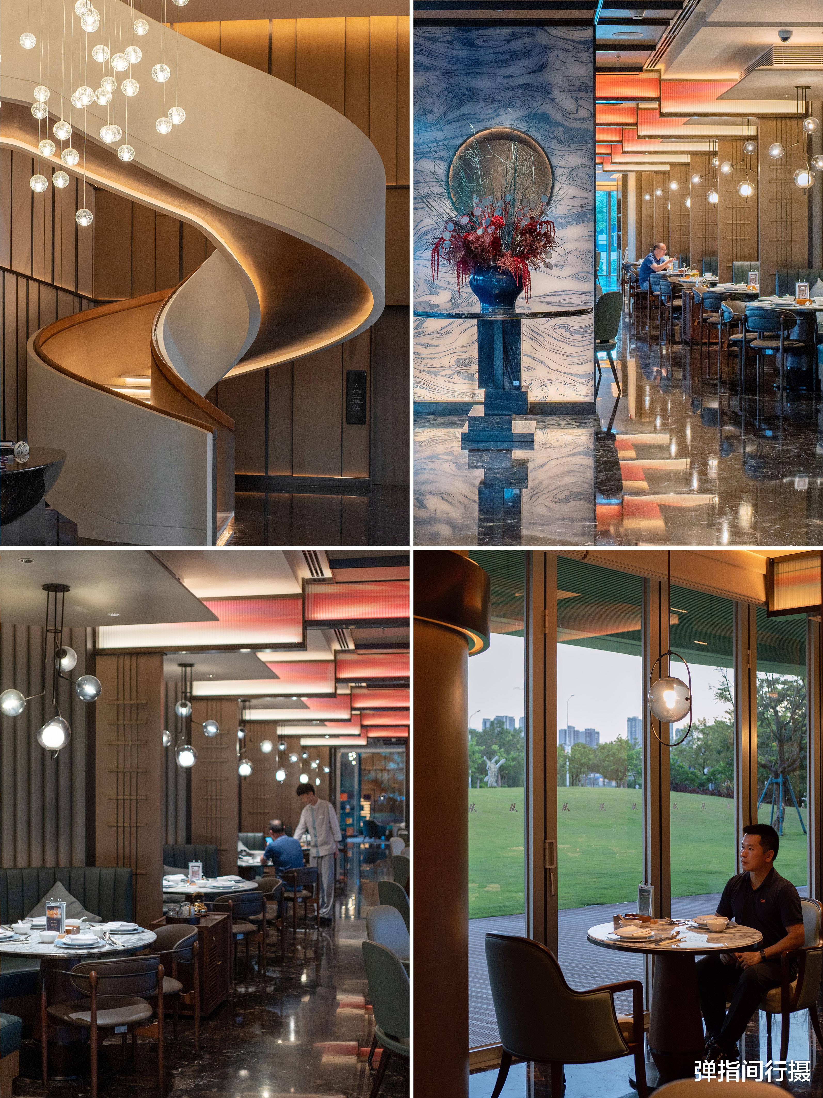林苑中餐厅是酒店餐饮的亮点。走进餐厅,粤剧元素扑面而来:红蓝撞色的装饰墙面呼应传统戏服,镂空屏风透出戏曲纹样,柱体设计成琵琶琴弦造型,在灯光下演绎着岭南文化的现代表达。转轴拨弦三两声,未成曲调先有情,食客在此刻开启一次灵感迸发的味蕾穿“粤”之旅。