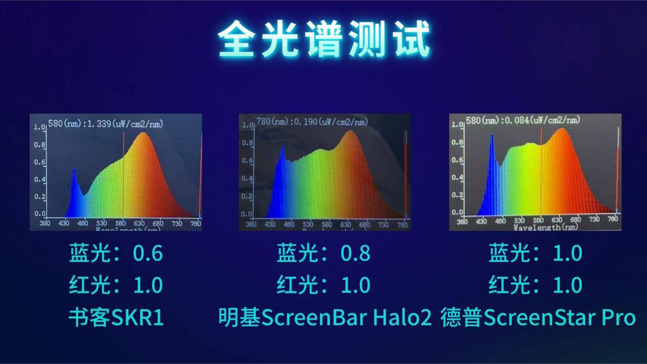 德普屏幕挂灯好用吗?这三款屏幕挂灯的全光谱表现,书客SKR1的表现是最好的,蓝光含量仅有0.6,是三款里面最低的,采用蓝光过滤技术通过特殊光学处理,有效吸收并偏转部分蓝光,显著降低短波蓝光辐射,该技术不仅能保护眼睛免受有害蓝光伤害,还能减少约64%的蓝光刺激,提升视觉舒适度。而明基ScreenBar Halo2的蓝光含量是0.8,相对来说也是比较好,有经过一定的处理,而德普ScreenStar Pro的蓝光含量1.0是三款屏幕挂灯里面最高的,虽然三款屏幕挂灯的红光含量都是1.0,但高蓝光的款式长时间使用会更容易感觉到眼睛疲劳。