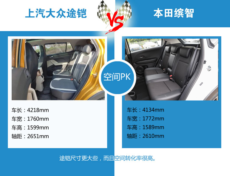 途铠的长宽高为4218/1760/1599mm,轴距为2651mm。缤智的长宽高为4328(4340)/1772(1790)/1605mm,轴距为2610mm。两者相比,途铠轴距更大,缤智尺寸更大,空间转化率如何还要进到车内才知道。