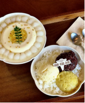 推荐他们家的榴莲白雪黑糯米和金桂丸子豆酪,小丸子软软糯糯的,豆酪淡淡的奶香味,还挺好吃的~