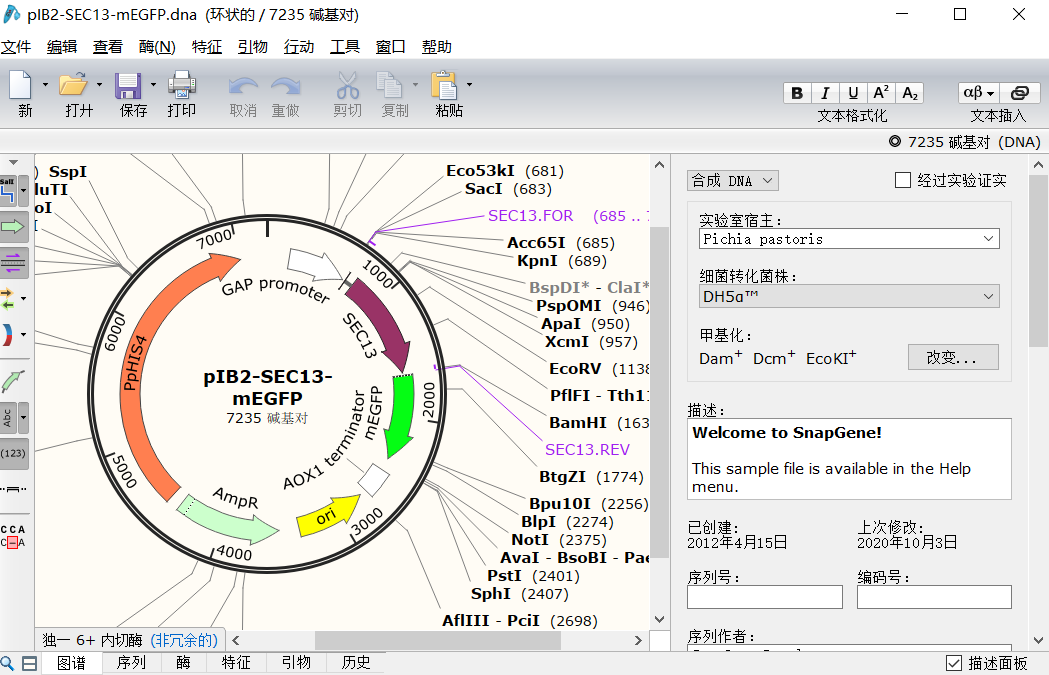 SnapGene是一款专业且强大的分子生物学软件,专为分子克隆和DNA序列分析而设计。它提供直观的图形化界面,让用户轻松绘制、注释、模拟和分享基因克隆方案,具备详尽的限制性酶切分析、PCR引物设计、序列突变模拟等功能。同时,SnapGene 6支持无缝对接常用实验流程,帮助科研人员高效设计和优化实验策略,极大提升分子生物学研究的便利性和准确性。本文提供SnapGene 6.0.2软件下载,中文版永久激活免费使用。