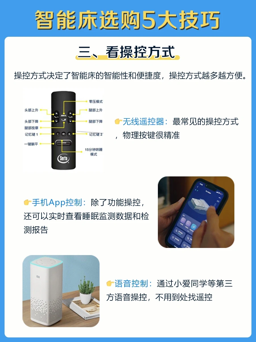 操控方式决定了智能床的智能性和便捷度,操控方式越多越方便,一般有:无线遥控器、手机App控制和第三方语音控制。