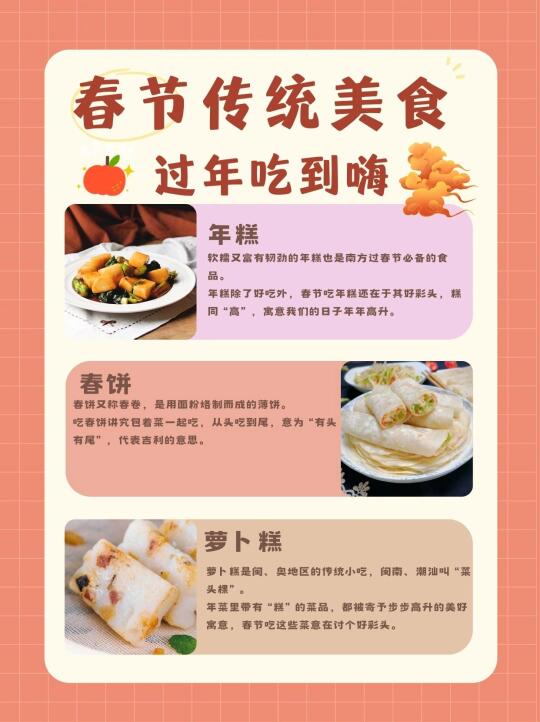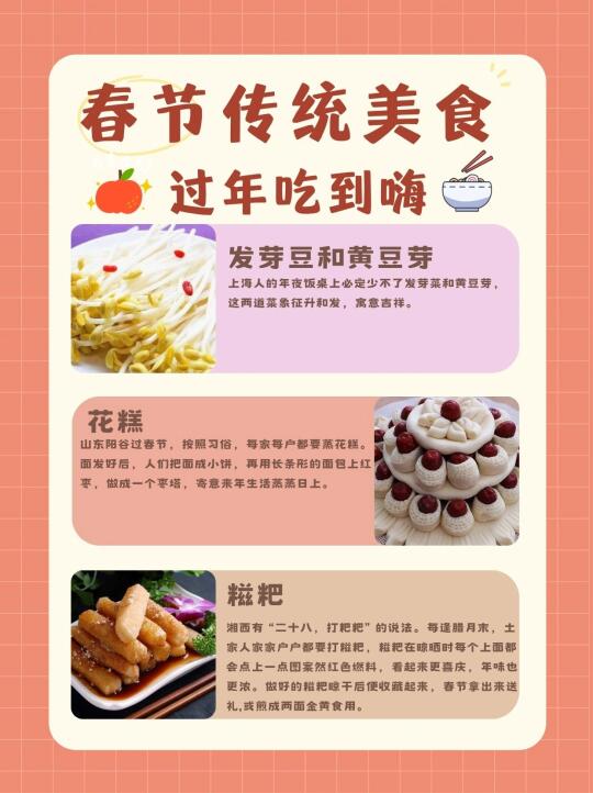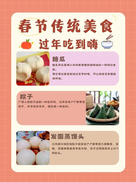 看春晚,吃美食,春节,总要吃点不一样的,各地又各有特色,你的家乡又有什么特色美食呢?🍱 1⃣腊味 腊肉、腊肠、腊鱼是南方一些地区必备的春节美食。麻辣的川味腊肠、微甜的广式香肠、色彩红亮的湘西腊肉、金华火腿都很受欢迎。 2⃣饺子 饺子是北方人过年必吃的食品,因其形似元宝,被人们赋予“招财进宝”的寓意,人们还把寓意吉祥的硬币、糖果、红枣、花生等包在馅里面。 3⃣汤圆 南方过年的标配是汤圆。上海、江苏等地正月初一的早餐要吃汤圆,寓意团圆美满。 4⃣年糕 软糯又富有韧劲的年糕是南方过春节必备的食品。春节吃年糕在于其好彩头,糕同“高”,寓意日子年年高升。 5⃣春饼 又称春卷,是用面粉烙制而成的薄饼。吃春饼要包着菜一起吃,从头吃到尾,意为“有头有尾”。 6⃣萝卜糕 萝卜糕是闽、奥地区的传统小吃,闽南、潮汕叫“菜头棵”。年菜里带有“糕”的菜品,寓意步步高升。 7⃣粘豆包 粘豆包又叫“年豆包”,是用黄米面做成的红豆、绿豆或豇豆馅的糕点,是东北人春节期间喜欢吃的一种粘食。 8⃣长面 也叫长寿面,福建闽南地区过年吃它,寓意“年年长久”。 9⃣馄饨 馄饨形似元宝,过年包馄饨很有讲究,要捍住馄饨皮的两角往里包,意为“兜财”。 🔟糖瓜 糖瓜是用小米和麦芽糖熬制而成的一种祭灶食品。用它祭灶意在粘住灶王爷的嘴,不让他在玉帝面前讲坏话。 1⃣1⃣粽子 广西人把粽子当做一种吉祥物,过年家家户户都要包粽子,年年粽年年中,图的是一种吉利。 1⃣2⃣发面蒸馒头 江苏部分地区在除夕前家家户户都要蒸几锅面食,发面、蒸面食取意来年发大财、日子过得蒸蒸日上讨个好彩头。 1⃣3⃣发芽豆和黄豆芽 上海人的年夜饭桌上必定少不了发芽菜和黄豆芽,象征升和发,寓意吉祥。 1⃣4⃣花糕 山东阳谷过春节,每家每户都要蒸花糕,寄意来年生活蒸蒸日上。 1⃣5⃣糍粑 湘西有“二十八,打糍粑”的说法。 🌺 听说今年也要办春晚,一起来热热闹闹过春节啦? 欢迎大家在大年三十18:00在看 《大家的春晚》直播呀!我是恬小雨,和我一起看春晚