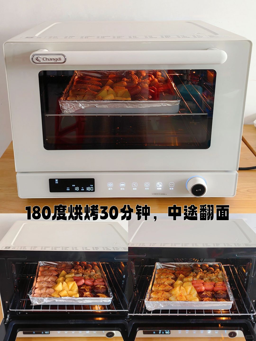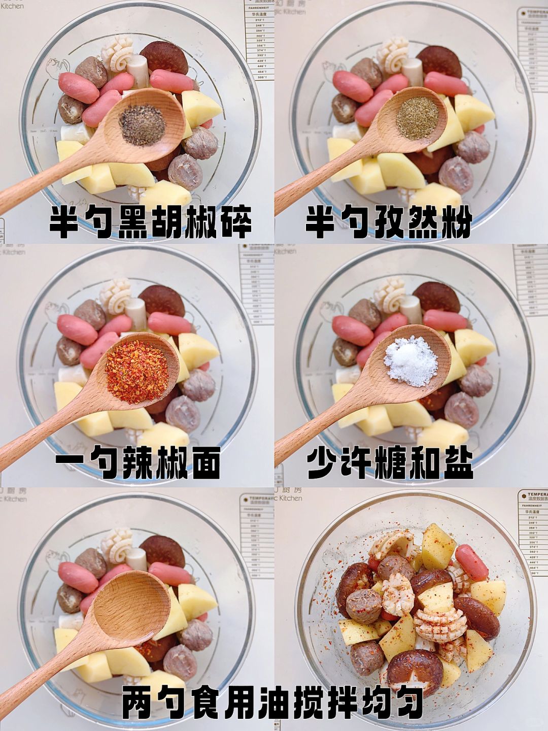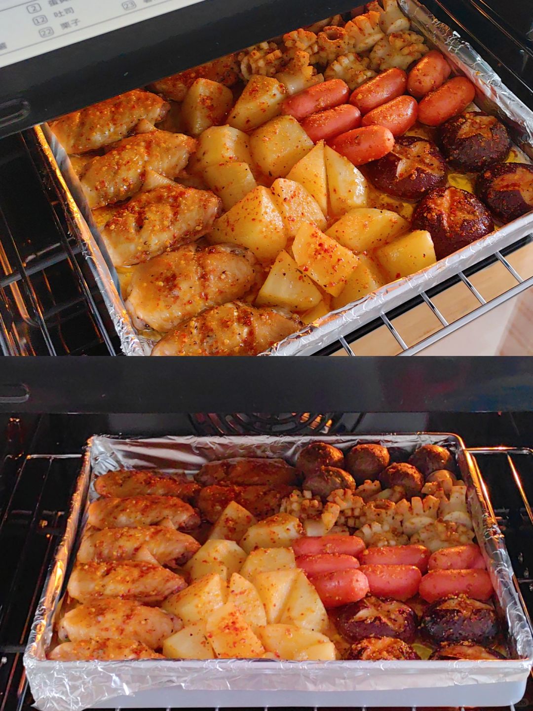 3⃣、将准备好的食材倒入铺好锡纸的烤盘中中,放入预热好的烤箱中下层,上下火180度烤30分钟,中途刷一次油,出锅撒上烧烤料即可