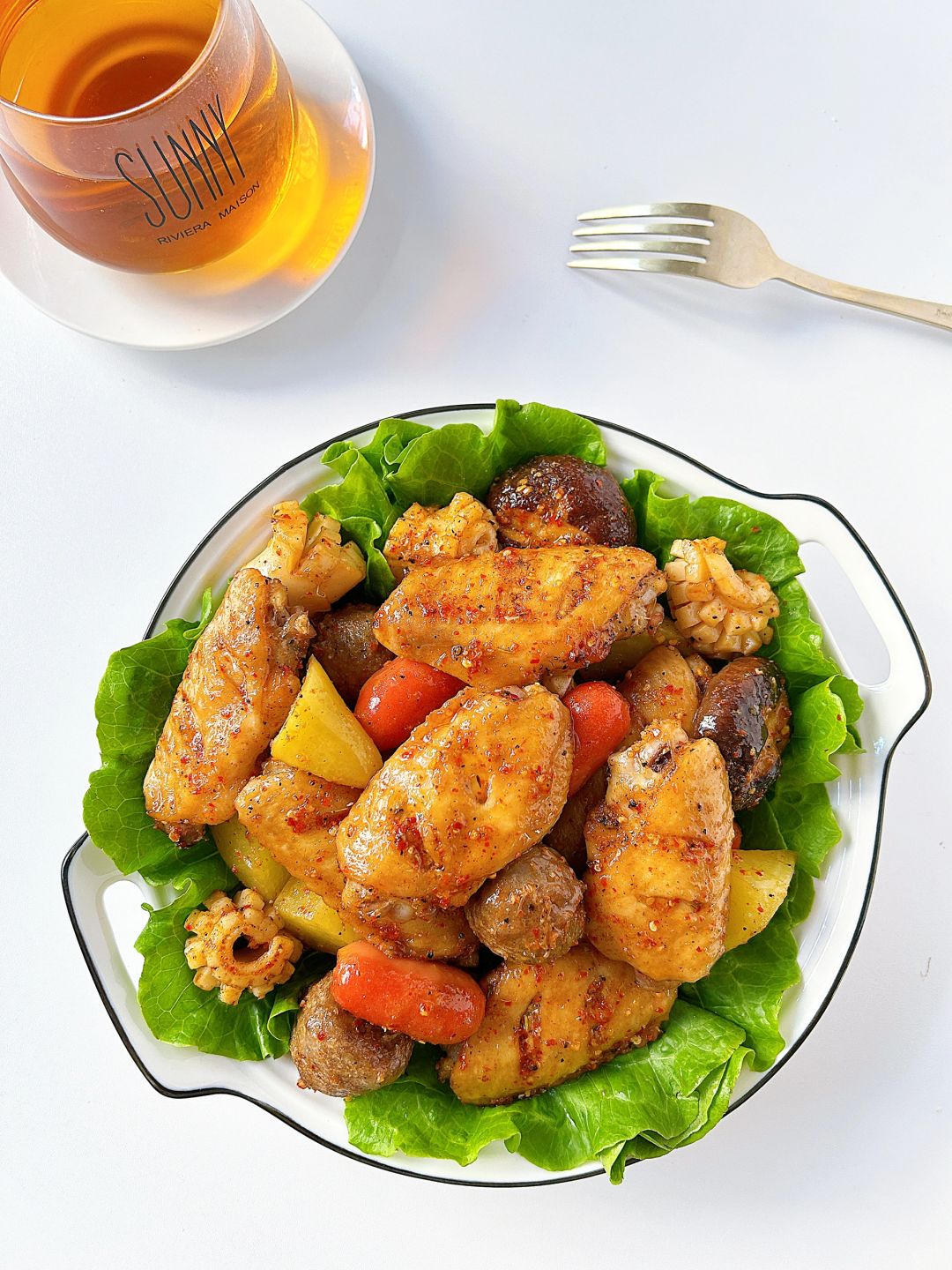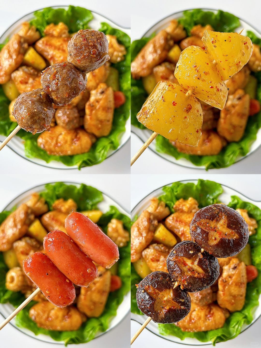 鸡翅、火锅丸子、土豆、香菇、蒜粒