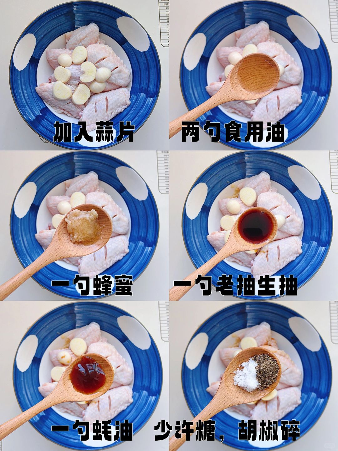 1⃣、鸡翅洗净背面划刀,加入蒜片、一勺生抽、一勺蜂蜜、一勺老抽生抽,一勺蚝油、少许盐,糖,胡椒碎,拌匀腌制