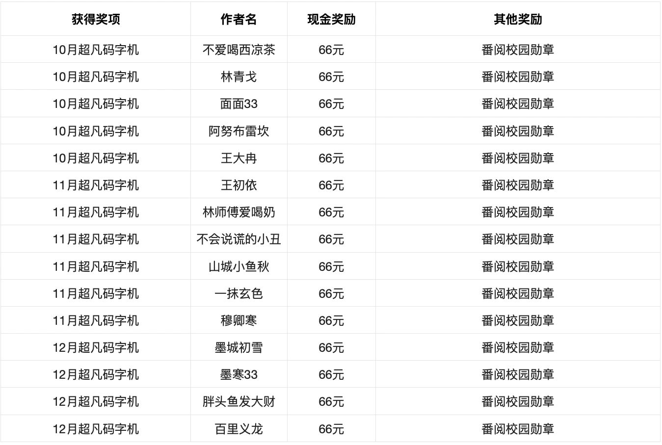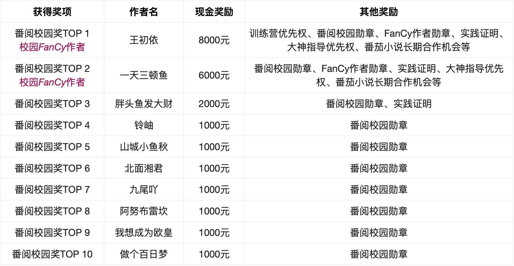 根据评选,作品阅读数据及「作家观察团」成员评审结果排序前10的作者获得了「番阅校园奖」。
