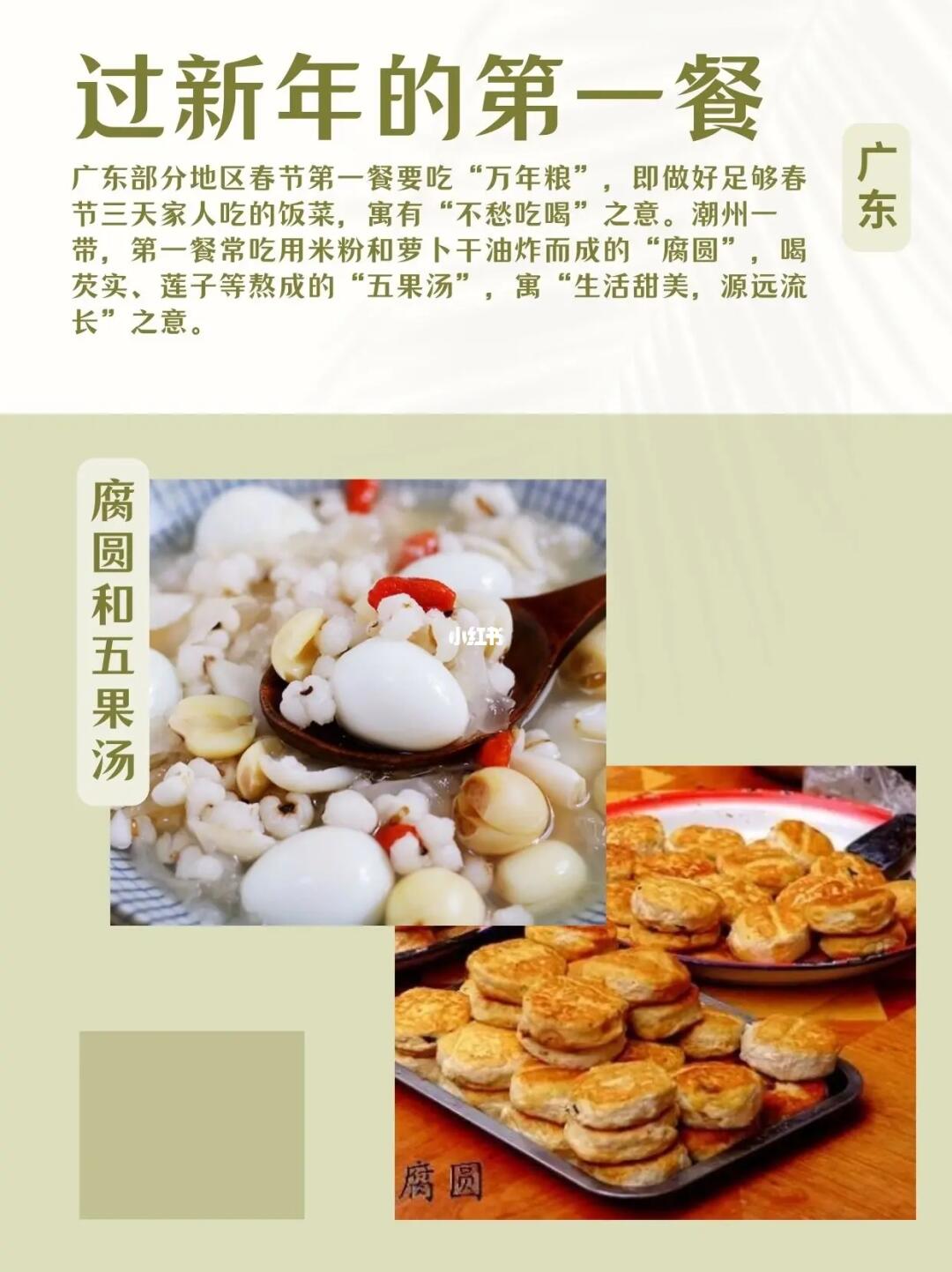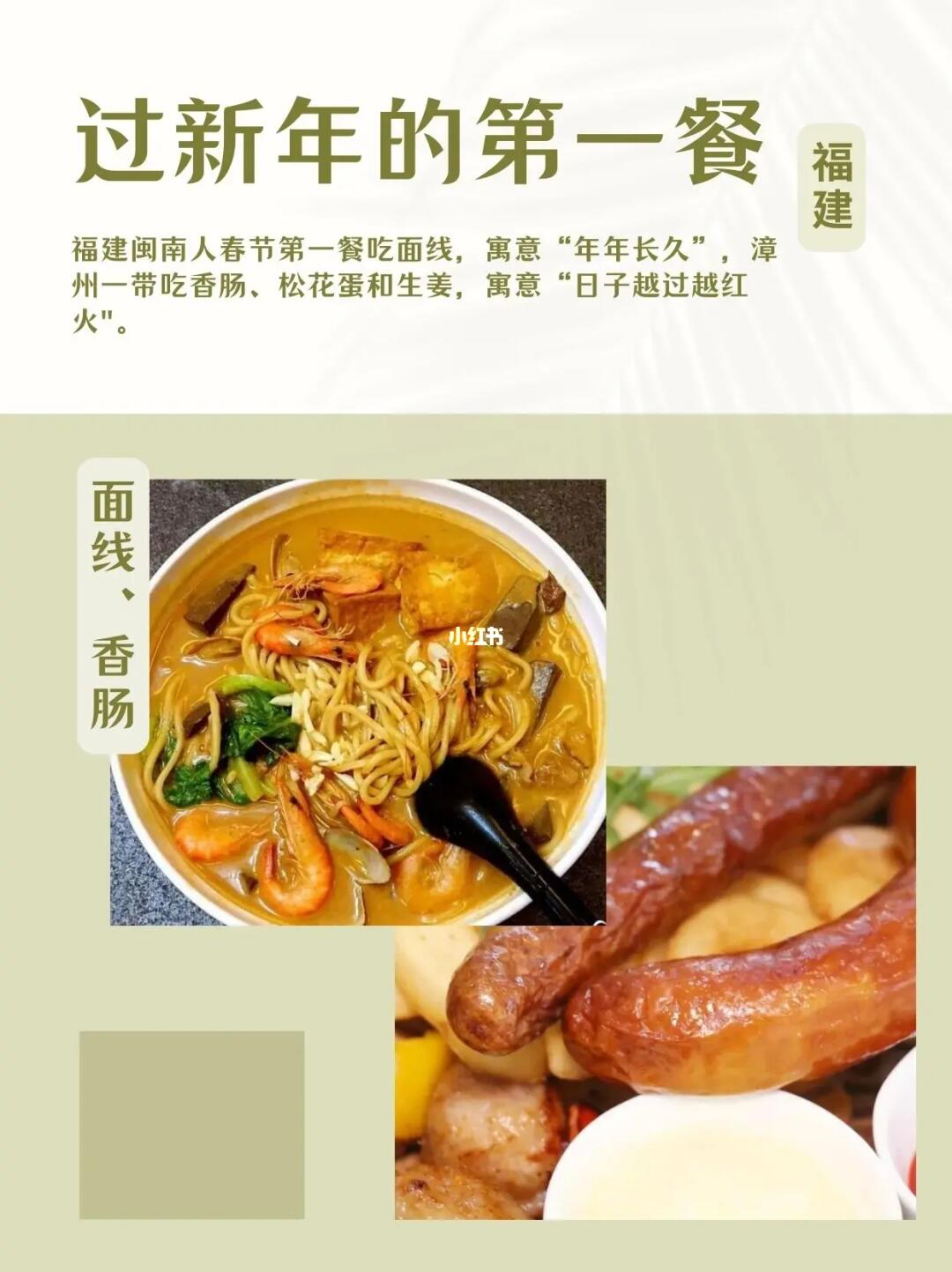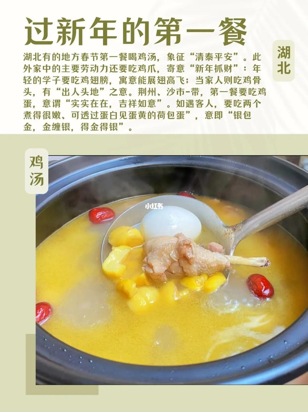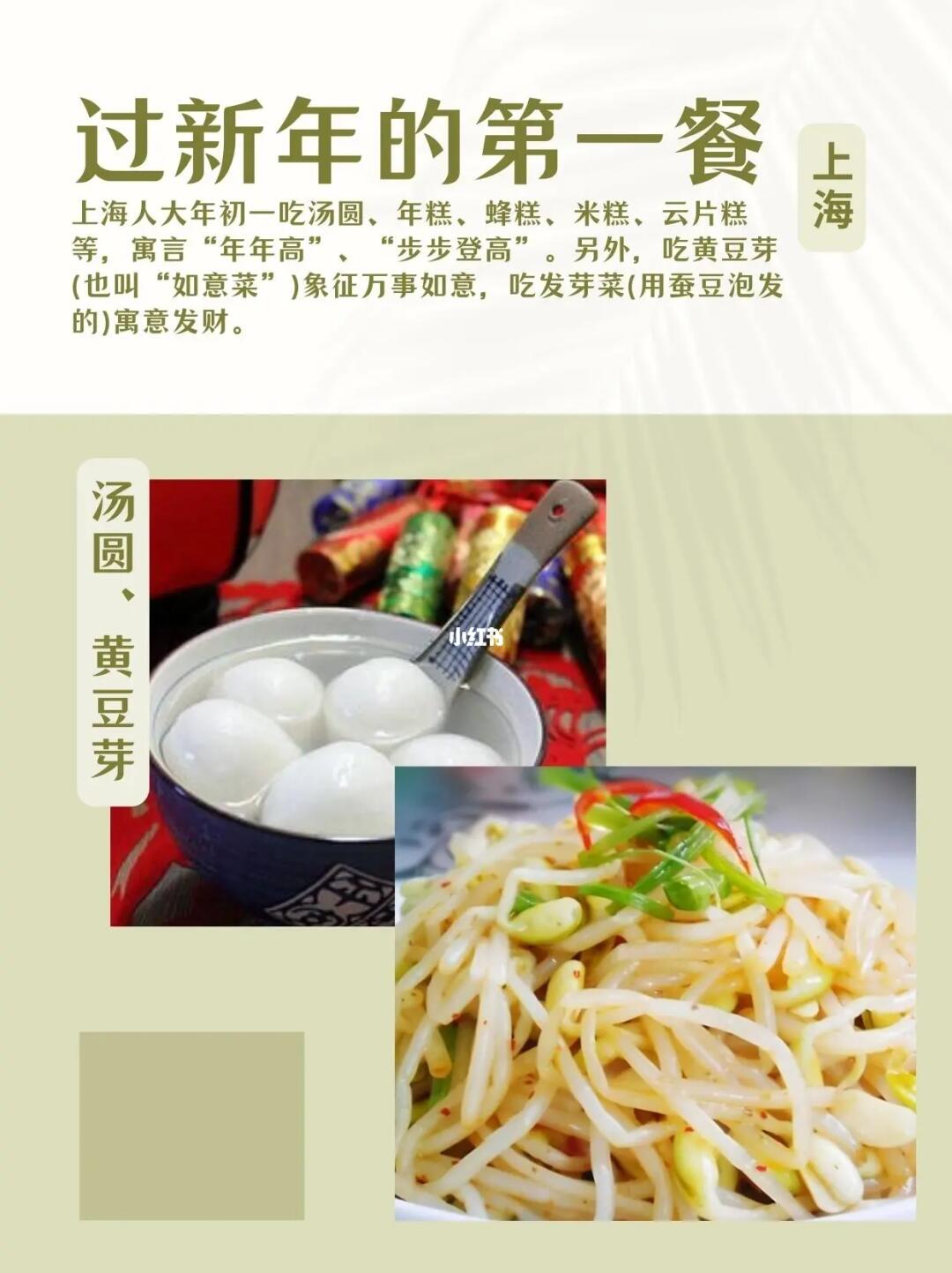大年初一吃什么,各地饮食不同,但都象征美好甜蜜,快来领取你家乡的兴旺美食秘籍吧[赞R] . 🌸湖南 湖南春节D一餐吃“年糕”,意为“一年更比一年好”,少部分湖南苗族人民,春节D一餐是甜酒和粽子,寓意“生活甜蜜,五谷丰登”。 . 🍀湖北 湖北有的地方春节D一餐喝鸡汤,象征“清泰平安”。主要劳动力吃鸡爪:年轻学子要吃鸡翅膀;当家人吃鸡骨头。 . 🌸江西 江西鄱阳地区D一餐吃饺子和鱼,意为“交子”和“年年有余”,在饺子中放糖块、花和银币意味着“生活甜蜜”"长生不老”“新年发财”。 . 🍀广东 广东部分地区春节D一餐吃“万年粮”,做好够春节三天家人吃的饭菜,寓有“不愁吃喝”。潮州一带,D一餐常吃 “腐圆”,喝 “五果汤”,寓“生活甜美,源远流长”之意。 . 🌸广西 广西壮族人春节D一餐吃甜食,表示新的一年生活美好,甜蜜如意。 . 🍀福建 福建闽南人春节D一餐吃面线,寓意“年年长久”,漳州一带吃香肠、松花蛋和生姜,寓意“日子越过越红火"。 . 🌸江苏、浙江 江苏、浙江部分地方春节D一餐要吃由芹菜、韭菜、竹笋等组成的“春盘”,寓意“勤劳长久”。 . 🍀安徽 安徽一些地方春节D一餐时每人要咬一口生萝卜,名为“咬春”,可“除菌防病,新年吉祥”。 . 🌸关中、河南 关中、河南部分地方春节D一餐要吃饺子与面条同煮的饭,叫“金丝穿元宝”、“银线吊葫芦”。 . 🍀台湾 台湾春节D一餐吃“长年菜”,是一种长茎叶,有苦味的芥菜。有的还在菜里加细长粉丝,意即“绵绵不断,长生不老”。 . 🌸豫南 豫南一带除夕的年夜饭吃到午夜,当新年的钟声敲响的时候再端上一盘鱼,以示年年有余。初一早上将饺子和面条同煮着吃,面条代表钱串子,为发财之意。 . 🍀上海 上海人大年初一吃汤圆、年糕、蜂糕、米糕、云片糕等,寓言“年年高”、“步步登高”。吃黄豆芽象征万事如意,吃发芽菜寓意发财。 . 🌸四川 四川除夕时,一般都吃火锅,初一早上吃汤圆,意为团团圆圆。 🌺 听说今年也要办春晚,一起来热热闹闹过春节啦? . 欢迎大家在大年三十18:00在看 《大家的春晚》直播呀! 我是恬小雨,陪大家一起春节啦!