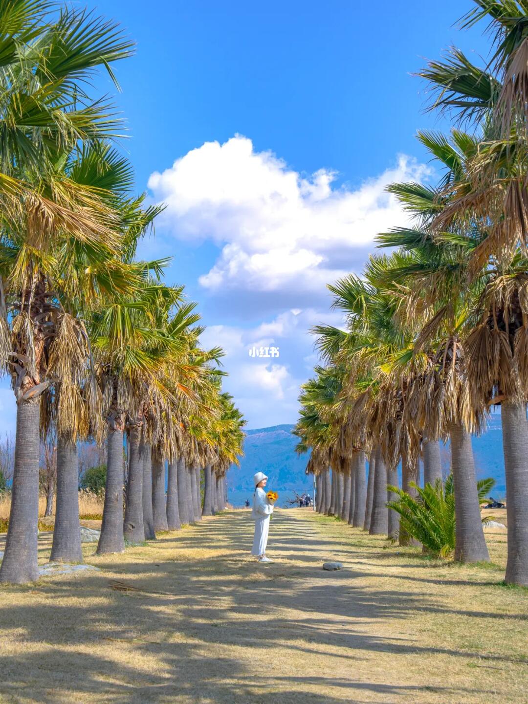 两排整齐的棕榈树。面潮洱海,背靠苍山,仿佛自己到了海边一样
