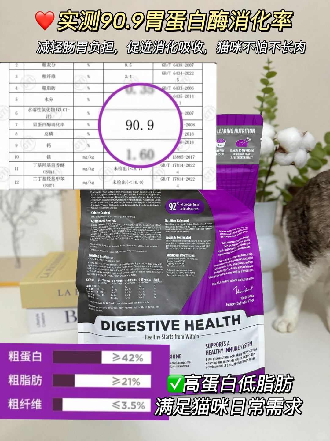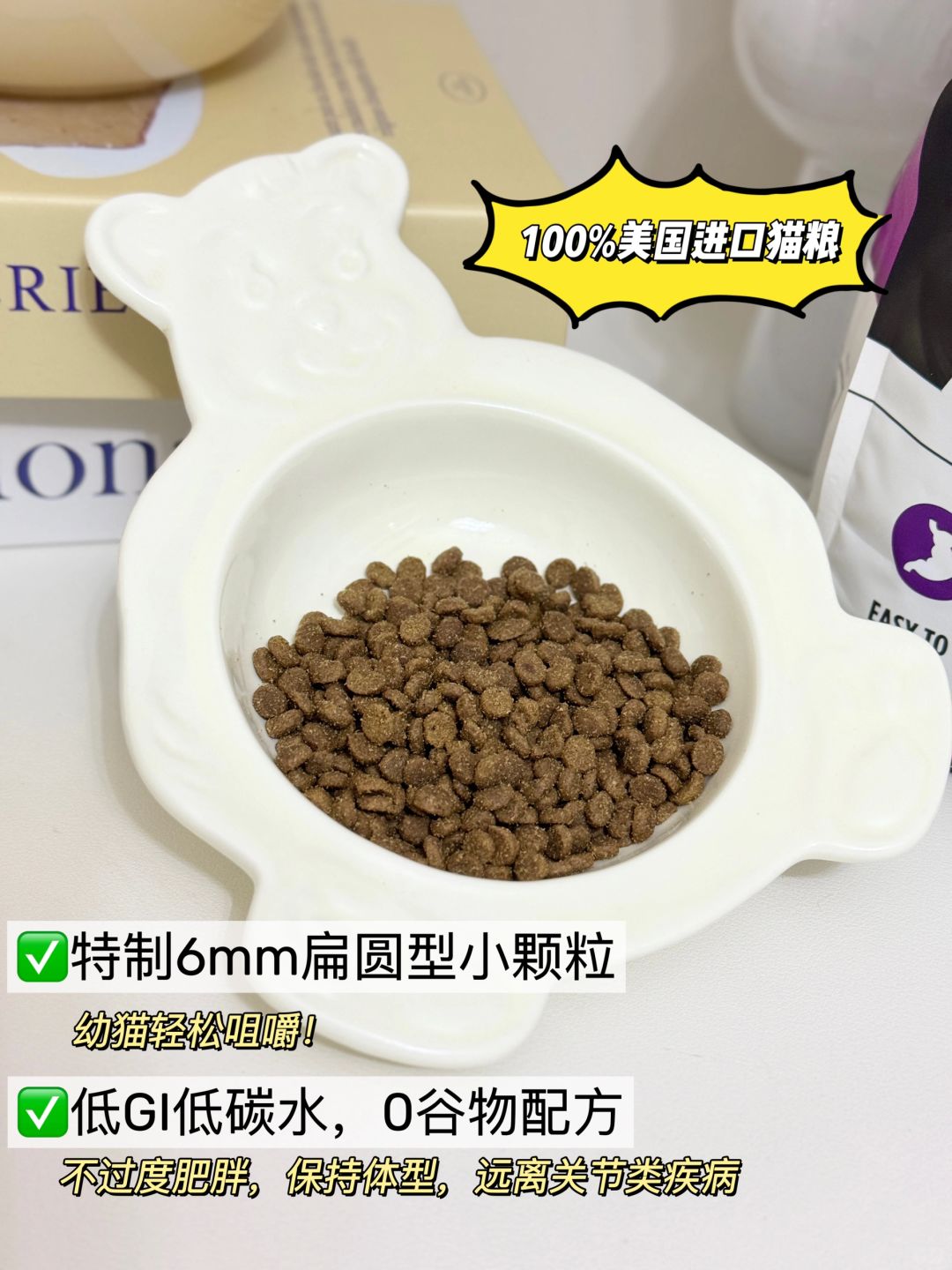 营养当然也不能落下,它是100%美国进口的,鸡肉和白鱼是主要肉源,提供的维生素、矿物质丰富,优质动物蛋白占比有92%,符合小猫咪的食肉胃,整体还是低GI低碳水的配方,毛孩子吃了会健康长肉,从小就形成良好体态,不容易引起关节类疾病。