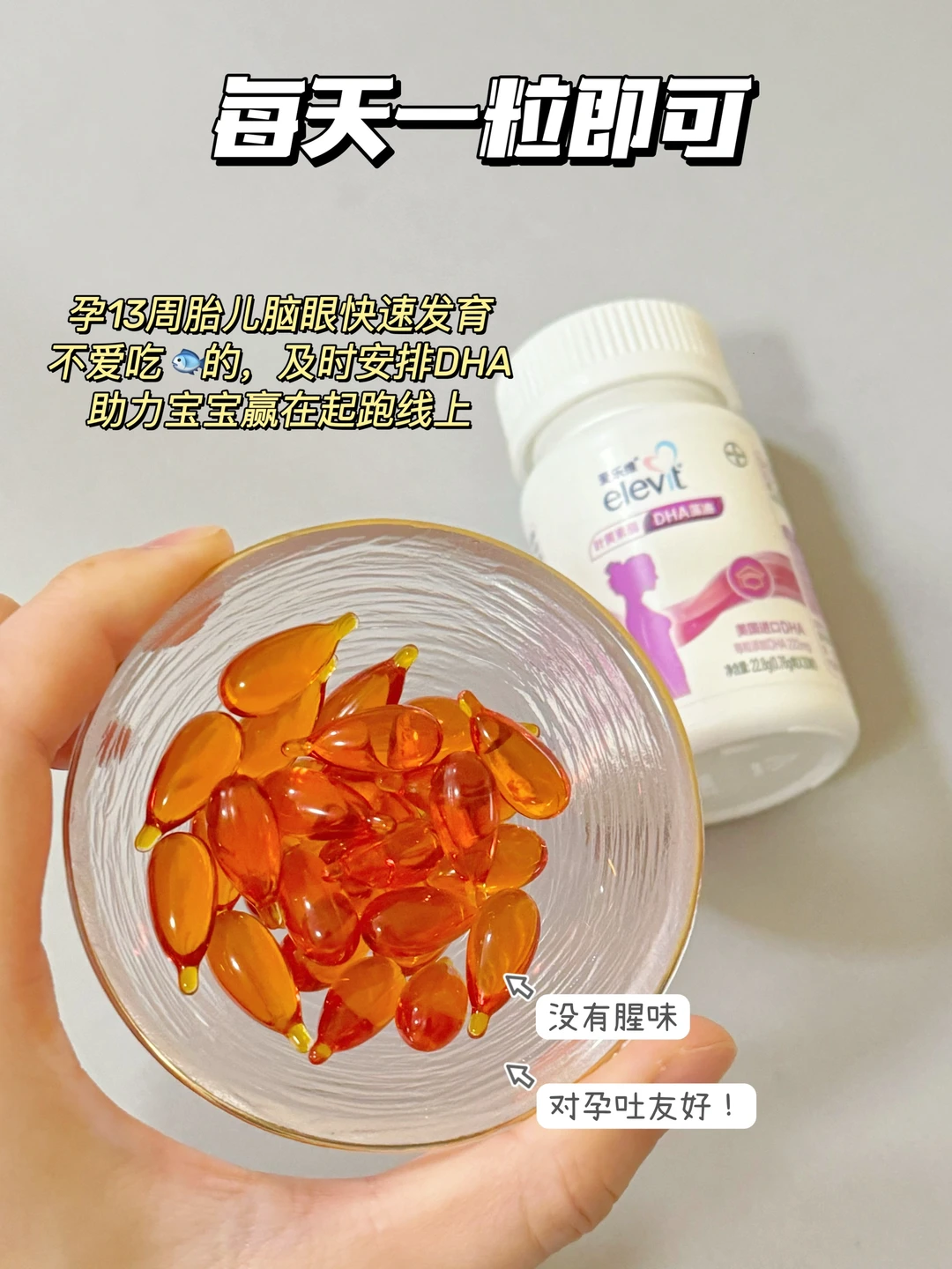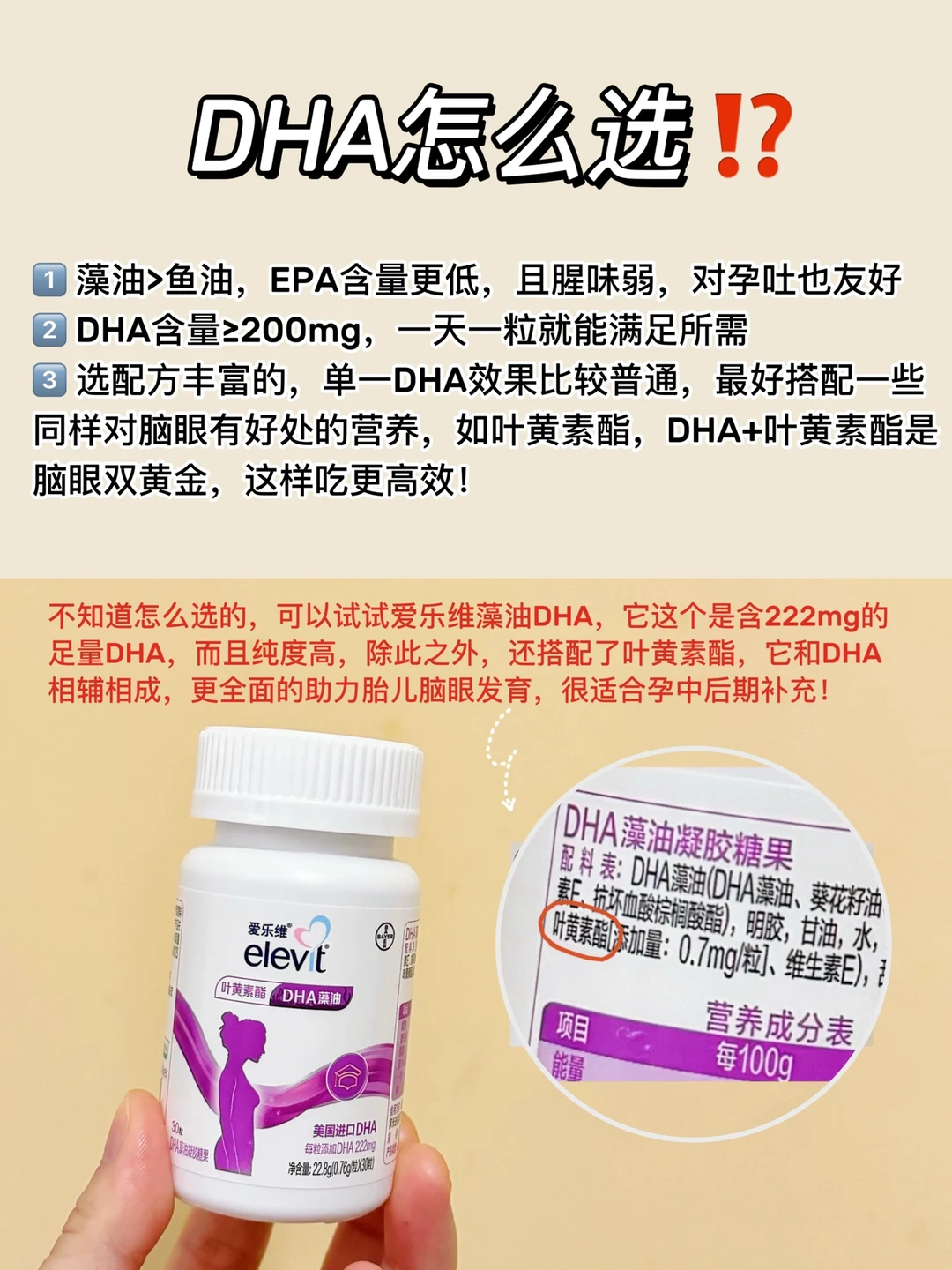 ③孕中期开始胎儿脑眼飞速发育,急需营养的补充到位。而胎儿脑眼发育👉离不开DHA和叶黄素酯的参与,可以吃含叶黄素酯的DHA补剂,比单一的DHA更全面‼️推荐爱乐维藻油DHA,它这个就是✔️含222mgDHA+叶黄素酯的,很小一颗,吃起来没有腥味,对孕妇很友好。