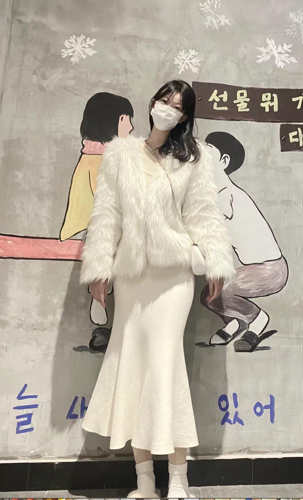 今天去堆雪人,喝了热乎乎的咖啡今天的OOTD是白色鱼尾裙配白色貂皮好温柔的一套穿搭,感觉大波浪更显得温柔可爱🥰