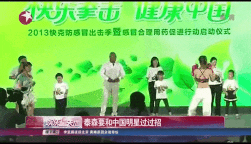 还作为“健康大使”,参加过快客感冒药的宣传活动。并在活动中和一群小朋友们,整齐划一地挥动拳头,表演“拳击健身操”。