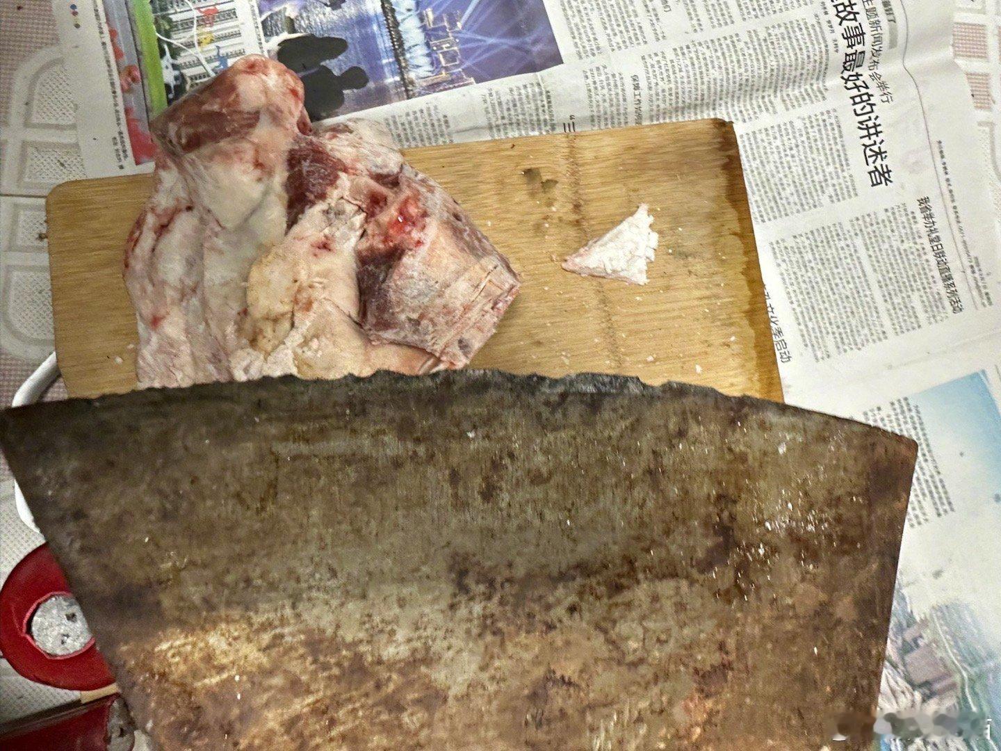 新疆朋友送了我一只冻羊腿。今晚上,我想砍一块下来解冻后吃。用了大砍骨刀和铁哑铃,没等砍下肉来,铁哑铃已经断了,砍骨刀已经成了砍骨锯子。
