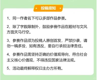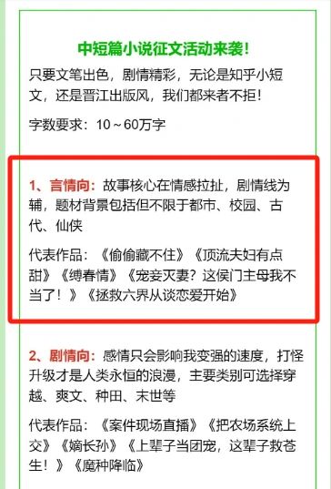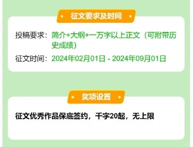 稿件字数: 10-60万 时间: 2月1日-9月1日 稿件: 简介+大纲+一万字以上正文 (可附带历史成绩) 方向:言情向、剧情向、脑洞向、知乎向 征文优秀作品: 保底签约,千字20起!