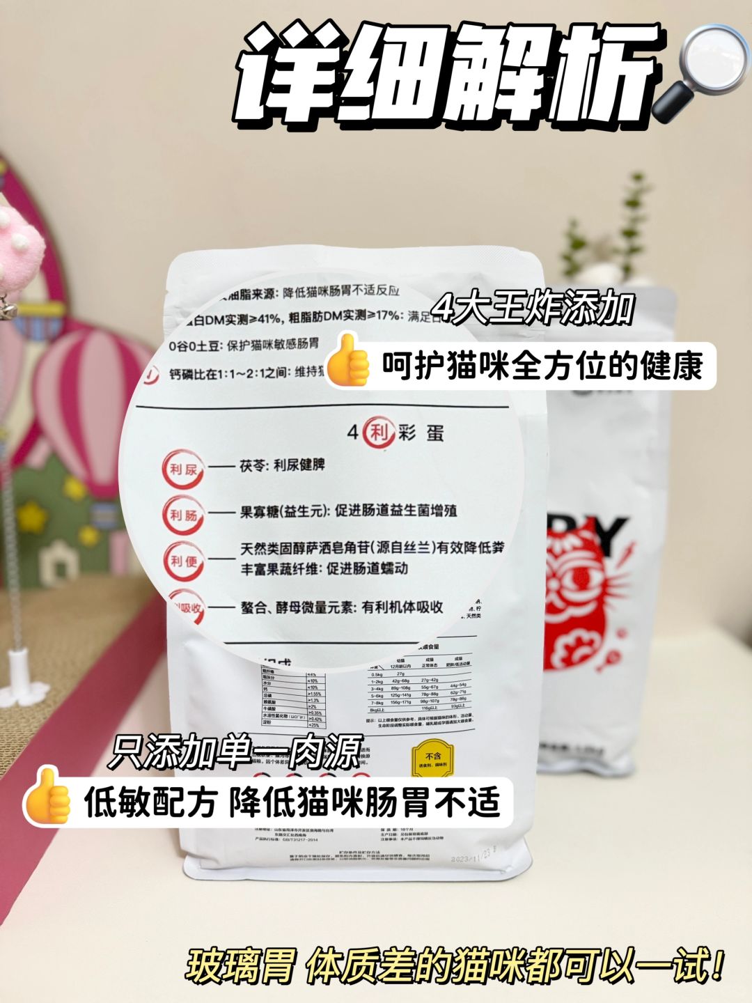 这个质价比超级高,别看粗蛋白有41%,但是因为D2C工厂直供,所以性价比可高了,我家毛孩子算下来一个月才一百出头,打工族也能轻松负担。单一肉源不容易过敏,玻璃胃小猫咪也可以试试,茯苓的添加对猫咪泌尿系统有好处。还有个让我很安心的点,这款粮上了老阳的品质追踪,每月送检,有问题乐意及时发现。我是省心宠上入手的,这上面的东西都挺不错的,品质过关,铲屎官们可以去看看。