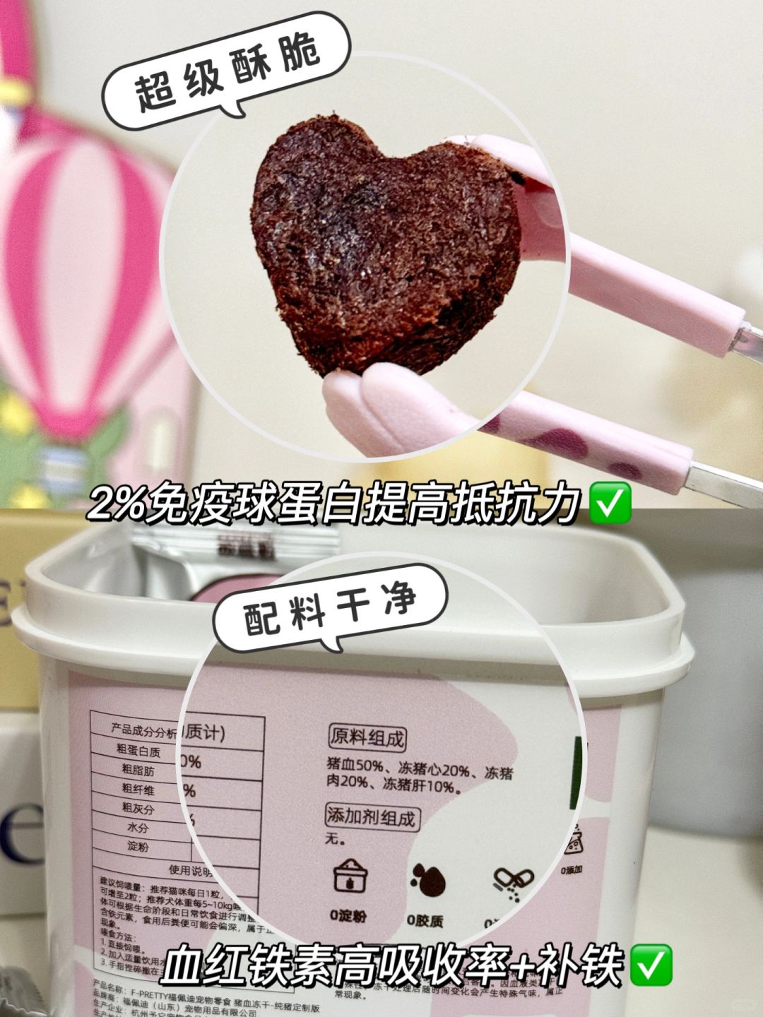 原料干净,都是来源于猪肉源,猪血比较有营养,2%免疫球蛋白提高抵抗力,血红铁素吸收率高还能补铁。