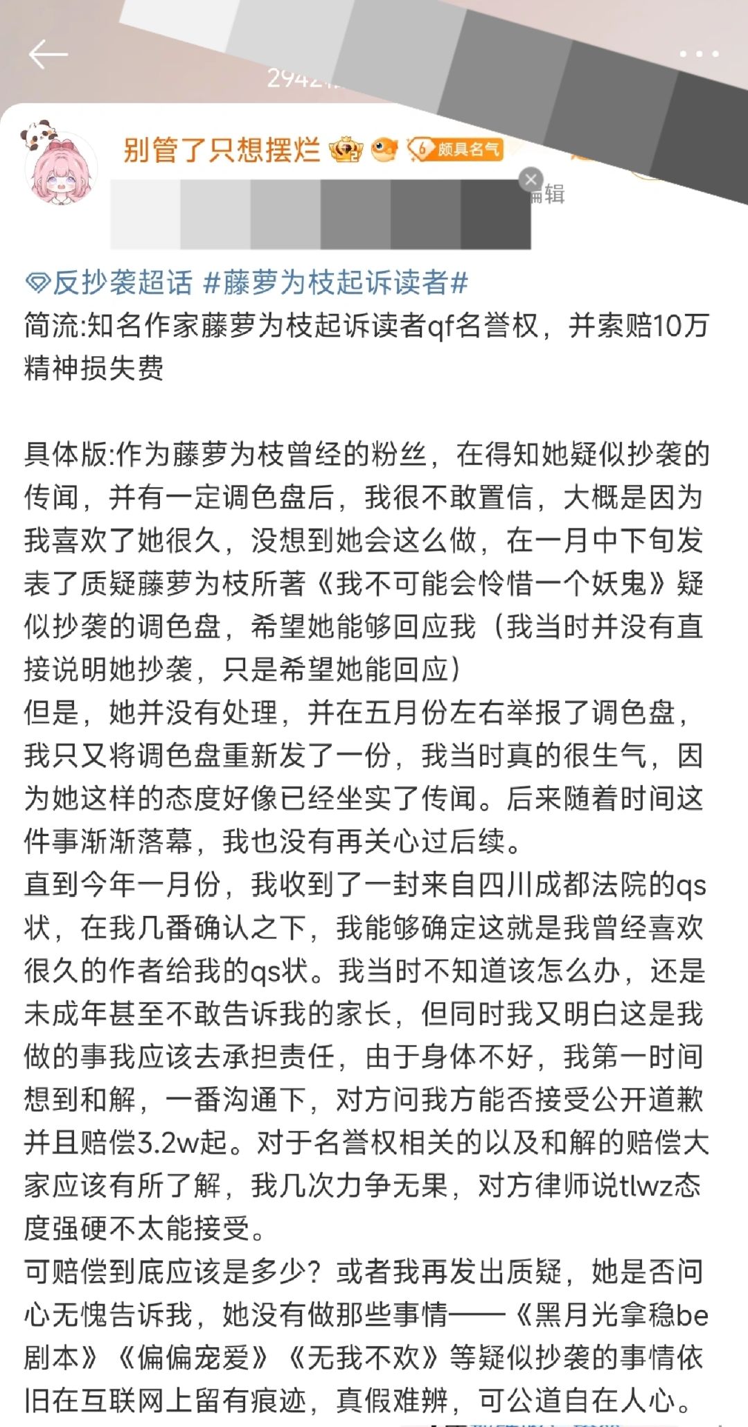 晋江作者藤萝为枝起诉读者qf名誉权,并索赔10万精神损失费[爆炸R] 该作者为《长月烬明》小说原著作者[爆炸R]