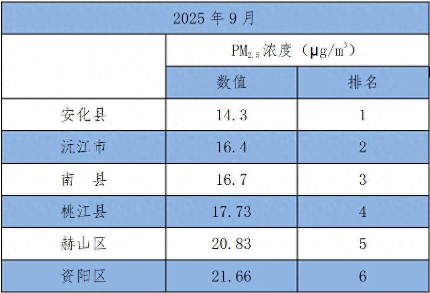 2025年9月,益阳市6个县市区空气质量PM2.5平均浓度由低到高排名前三的分别是:安化县、沅江市、南县。