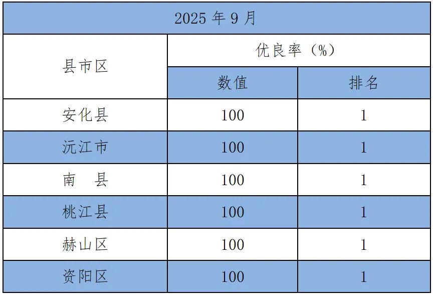 2025年9月,益阳市6个县市区空气质量优良率均为100%。