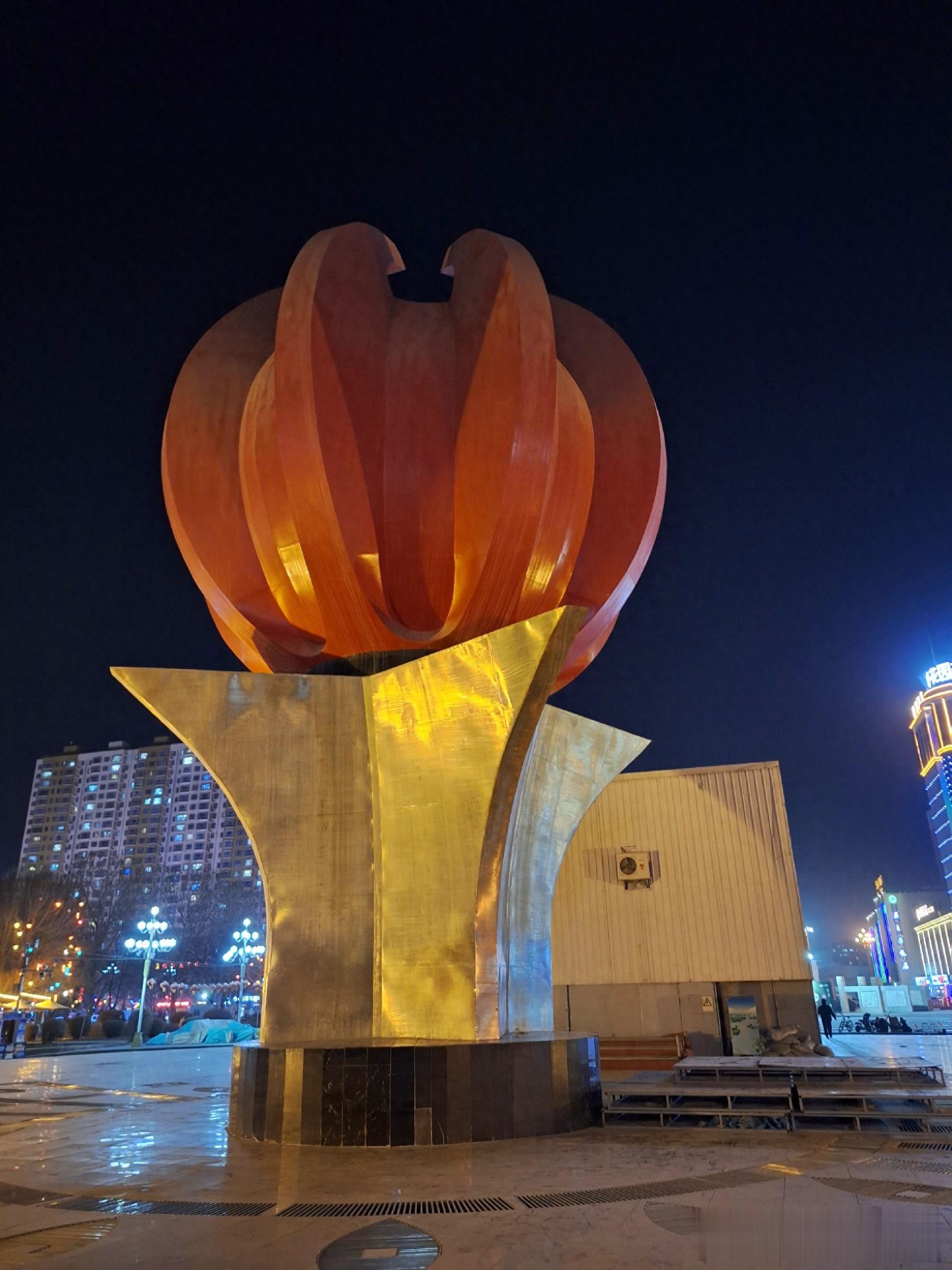 焉耆人民广场上的红花,代表该地三大红色产业辣椒、西红柿和红酒。