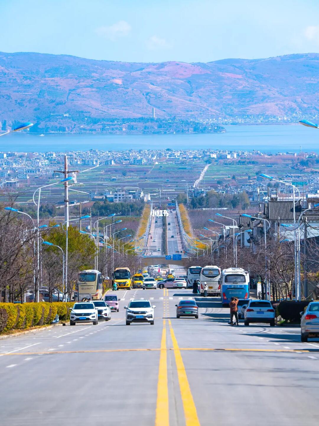 从高处可以俯瞰整个洱海,很壮观,安全拍摄要注意来往车辆