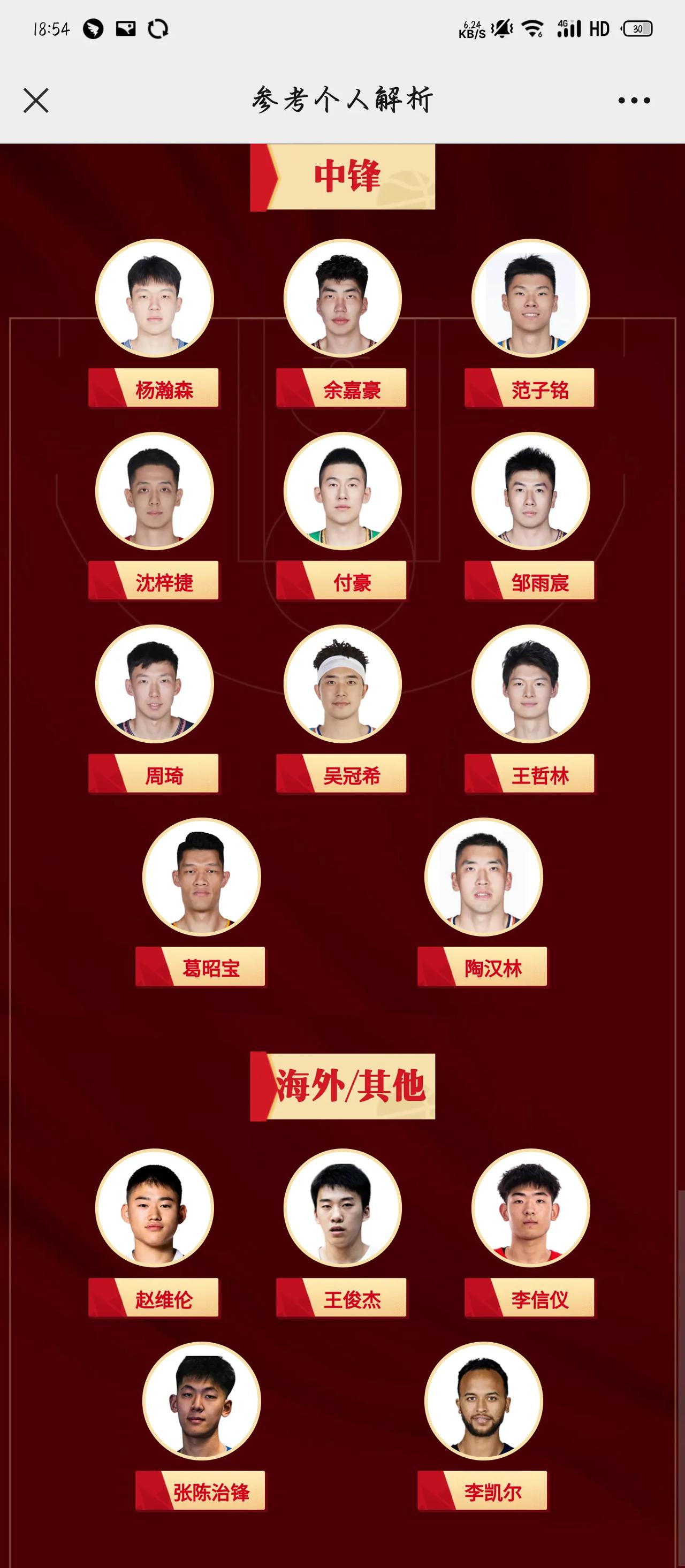 猜测一下过段时间男篮亚预赛的大名单: 后卫:赵继伟、胡明轩、程帅澎、徐杰(或廖三宁) 锋线:胡金秋、崔永熙、阿布都沙拉木、朱俊龙、齐麟、赵嘉义 中锋:杨瀚森、余嘉豪 Ps:徐杰和廖三宁纠结了好久,如果从体格上来说,廖三宁会更吃香。 #CBA联赛# #中国男篮# #中国篮球#