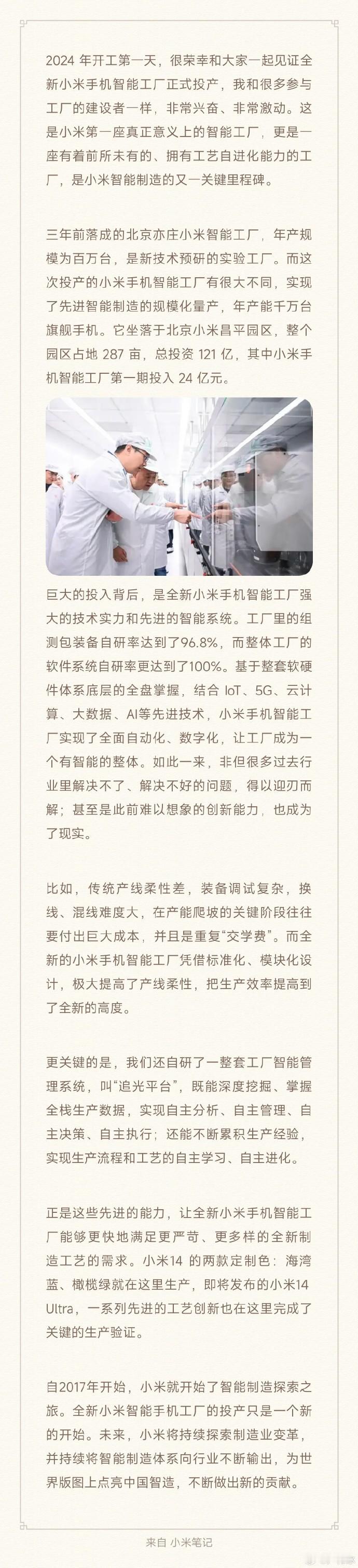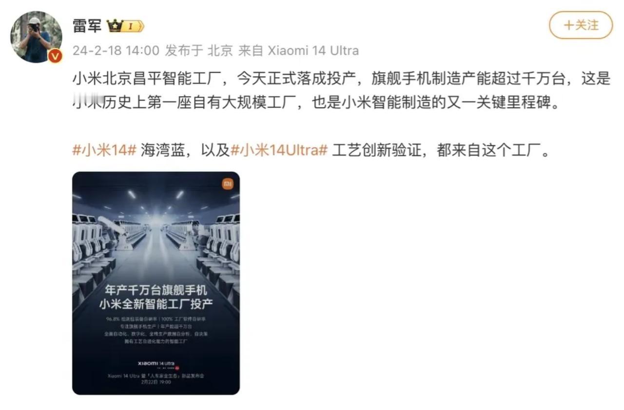 节后第一天上班,酝酿已久的小米果断打出王炸组合——小米14 Ultra和小米智能工厂。 作为手机行业的高热度“明星选手”,小米14 Ultra在手机圈备受期待不言而喻,现在#小米14Ultra发布会定档2月22日#,米粉的期待终于有着落了;此外,#小米北京昌平智能工厂正式落成投产#也是重磅消息,意味着小米具备年产能千万台的智能工厂落地了,还有谁说小米没有工厂吗? 现在到2月22日不到一星期,小米竟然如此沉得住气没有提早预热,一预热就进入冲刺阶段,说明小米对于这款影像旗舰充满信心,完全不需要过多的宣传,本身自带热点。不知道大家是否清楚,这次将由小米卢伟冰主讲发布小米14 Ultra,他第一次主讲小米发布会又是一大热点。小米顶级旗舰再加上小米人车家全生态首场发布会,BUFF简直可以说是叠满了。 随着发布会时间同时曝光的还有小米14 Ultra的外观,去掉溜背但保留直板设计,外观设计保留了“相机感”,还能看上去更加协调美观,这跟后壳采用新的材料不无关系,可以期待一下。形神兼具的是小米14 Ultra在外观“相机感”的基础上,再次拔高影像实力,毕竟小米近两年以来引领和推动移动影像发展有目共睹。 另一方面,小米自研智能工厂由来已久,小米北京昌平智能工厂正式落成投产,年产能超千万,意味着小米进入了高端制造的前列,向着高质量发展大踏步前进,开启中国智造新篇章,迎来里程碑式的胜利。说到“自研”,有些人可能有疑问,但是实际数据表明自研率接近100%,具体有组测包装备 96.8% 自研,软件 100% 自研,全厂专利数量超 500 件,自研名不虚传,实力不言而喻。 值得关注的是,小米智能工厂千万台年产能只是面向旗舰手机,由此表明小米围绕从实验室预研到量产的全流程,打造属于自己的超级工厂,节约下的成本还可以让利给消费者,高端性价比实力可以进一步巩固。最后,大家觉得小米旗舰手机年销量会达到千万水平吗?
