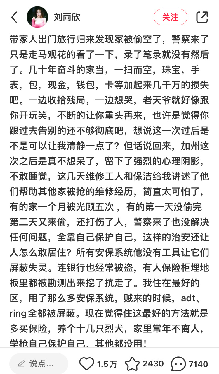 刘雨欣(步步惊心的明玉格格)美国家中被盗几千万,刚开始新生活,住在洛杉矶,漂亮国的治安全球最差。#刘雨欣 没绿卡没换国籍##刘雨欣家被偷空#