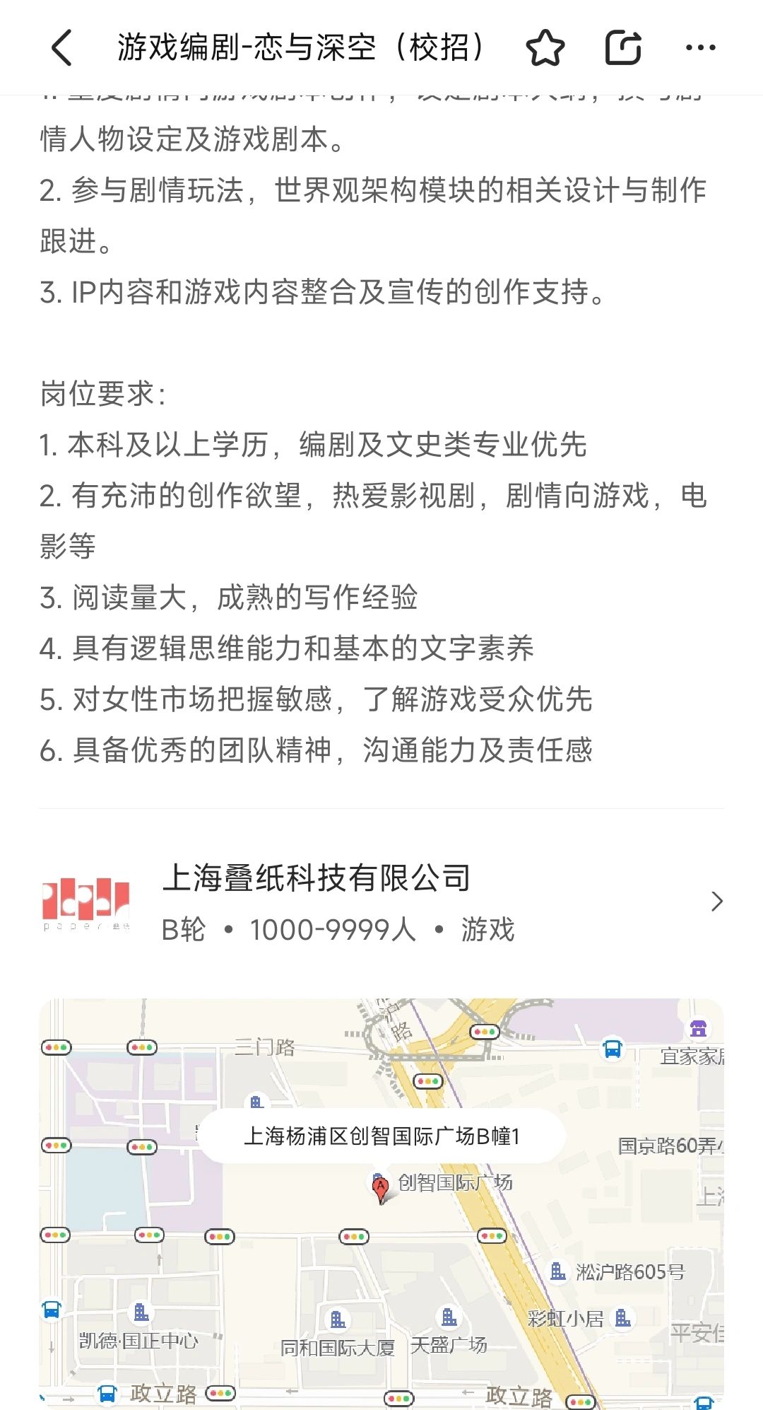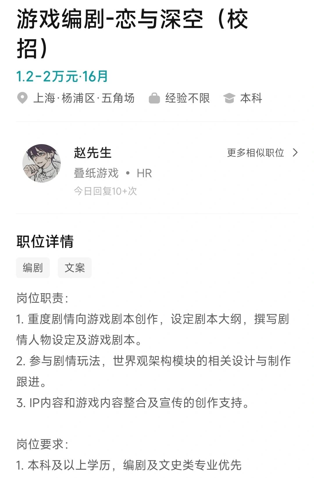 所以说恋与深空游戏的故事还没写完吗?[暗中观察R] 目前在岗的编剧只是定了一个大的故事框架和脉络,后续的故事发展走向和具体的人物剧情线暂时是🈳的,还得招人进去接着填补完善各种细节?[萌萌哒R] PS:〔校招〕招聘的是应届大学毕业生,或许最多只有几个月的实习经验? 叠纸打算让应届毕业生负责恋与深空哪一部分的剧情线呀?[吃瓜R][doge]